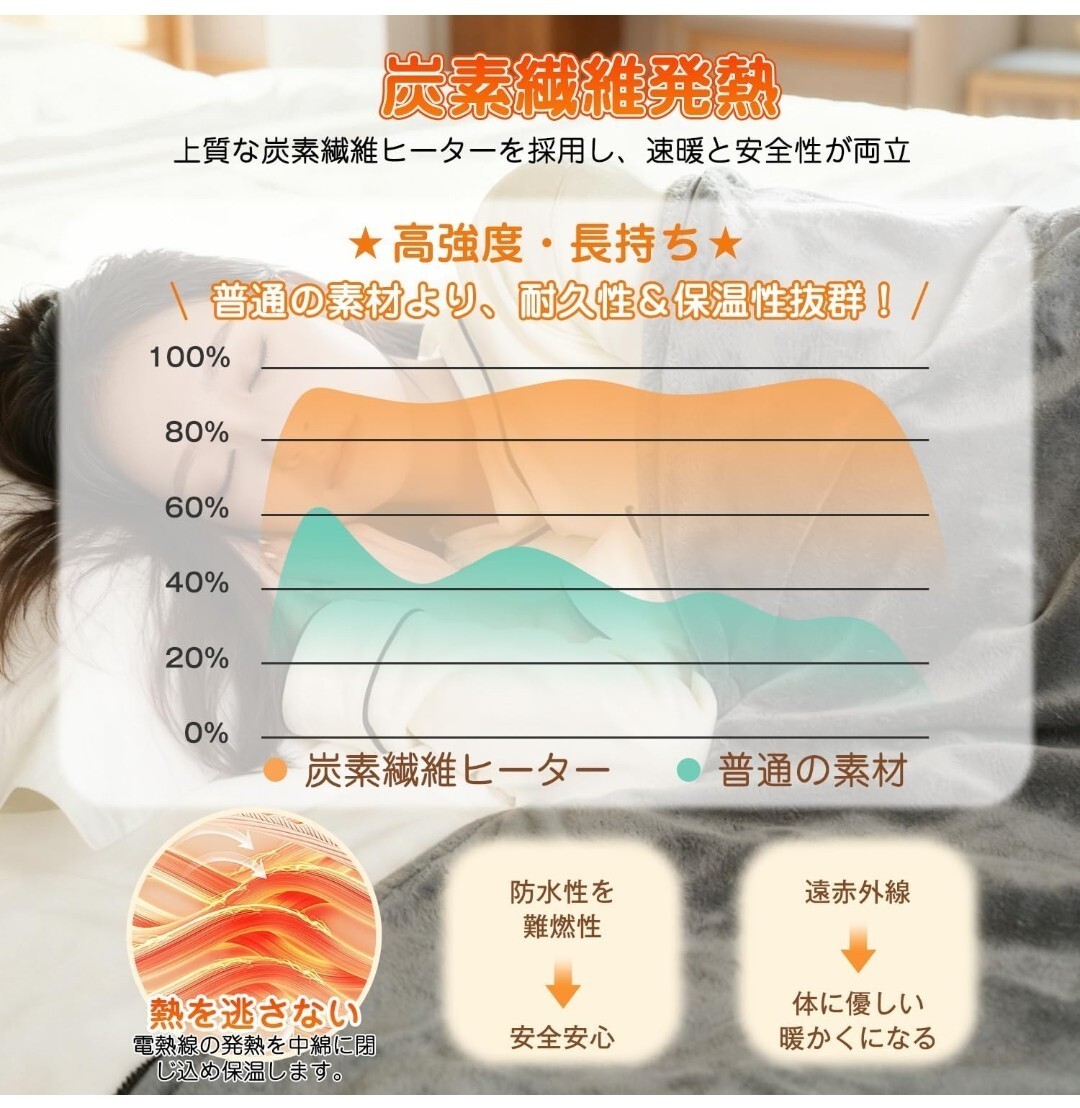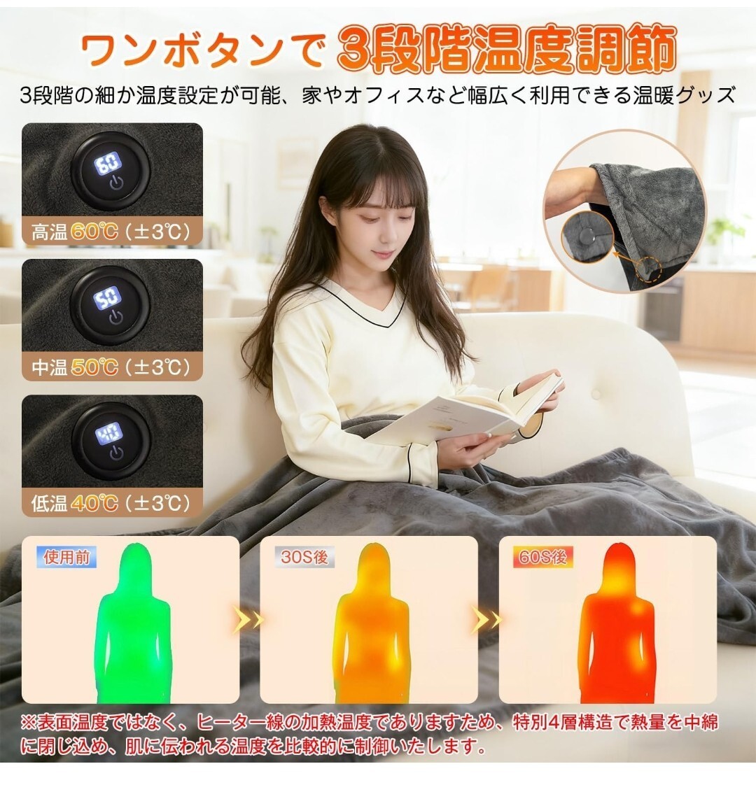【9本の炭素繊維による「均一発熱」& 3段階温度調節で、効率的な暖かさ】電気ブランケット 高品質な8本の炭素繊維を採用し、面で均一に発熱するため、一部だけが熱くなる「斑点発熱」を防ぎ、じんわりと広がる心地よい暖かさを実現しました。3段階の温度調節(高温60℃・中温50℃・低温40℃)で、その日の気温やご自身の体調に合わせて最適な温度をお選びいただけます。LEDディスプレイで設定温度が一目瞭然です。| 出价者 | 信用 | 价格 | 时间 |