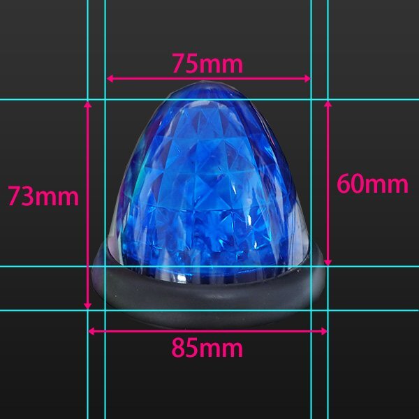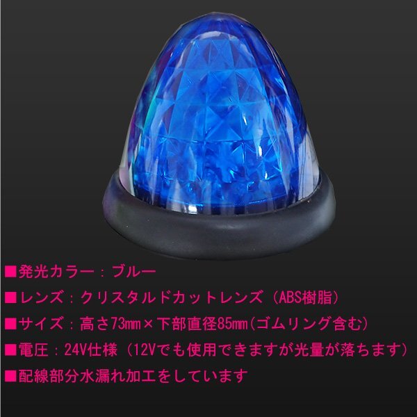 | 16個のLEDをクリスタルカットレンズが効果的に拡散し美しく輝きます。 従来の球タイプに比べ高輝度なLEDで、長寿命、低消費電力、デザイン性と機能性を両立しました。 ■発光カラー:ブルー ■LED:16連SMD ■レンズ:クリスタルカットレンズ(ABS樹脂) ■サイズ:高さ73mm×下部直径85mm(ゴムリング含む) ■電圧:24V仕様(12Vでも使用できますが光量が落ちます) ■配線部分水漏れ加工をしています ※配線部の防水コーティングにより、耐久性及び防水性の向上は期待できますが、 完全防水では御座いませんので、必要に応じ防水処理を施してください。