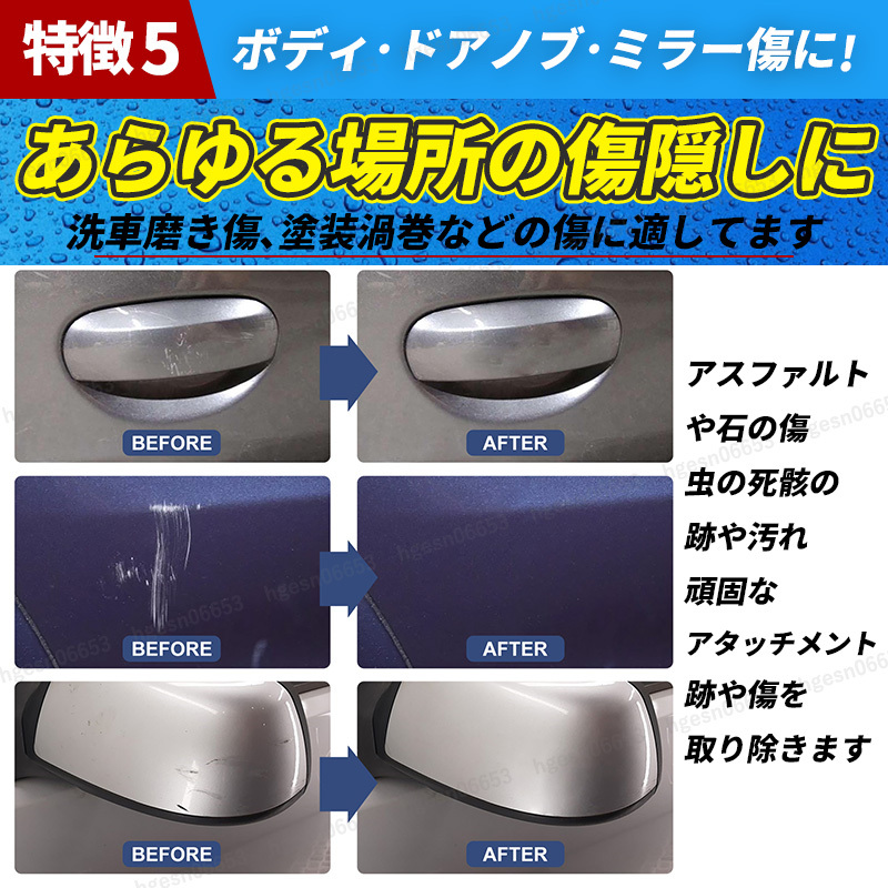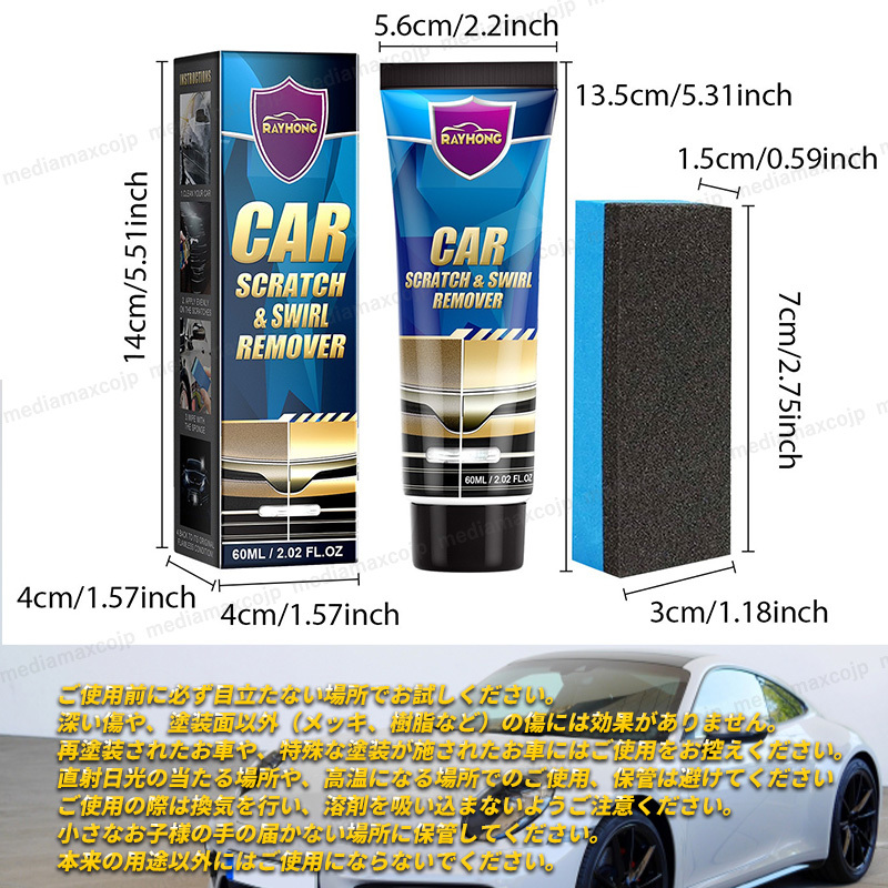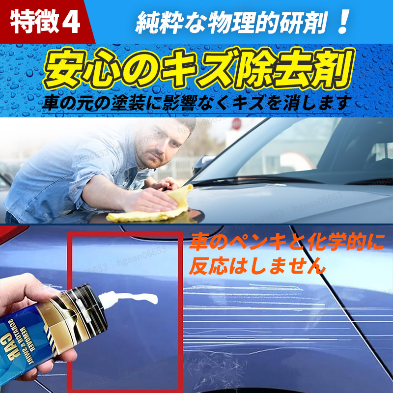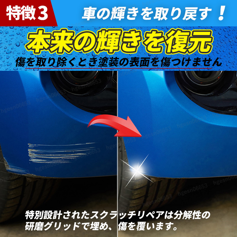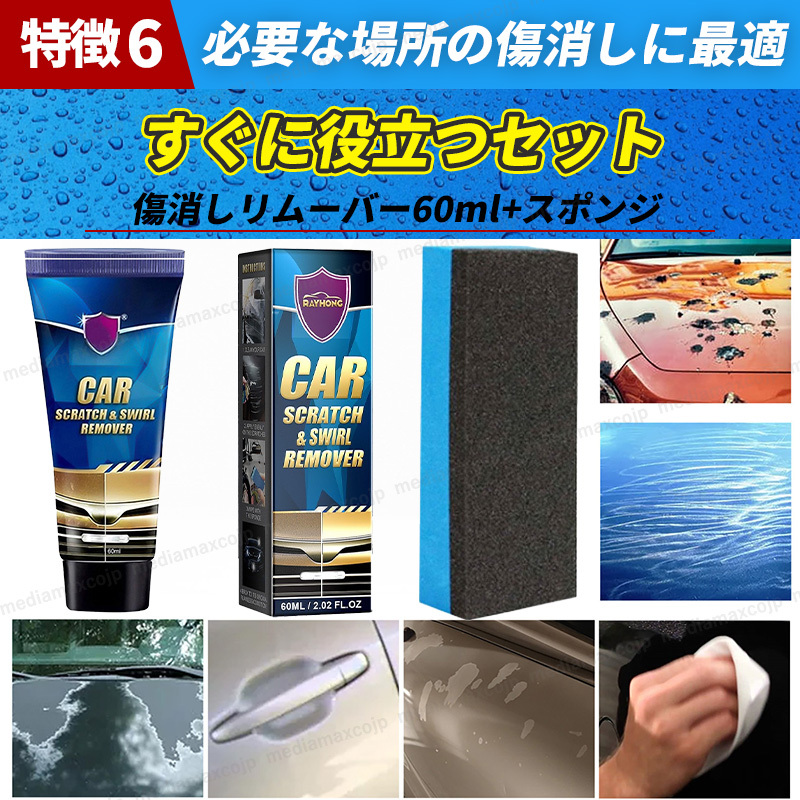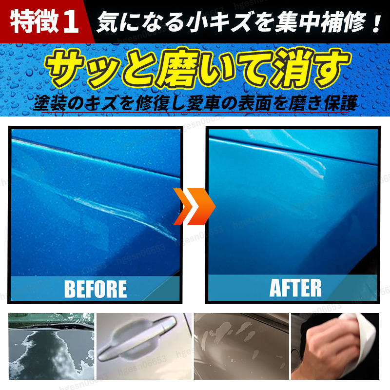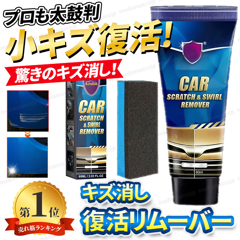 ミクロレベルで埋めていくから、まるでキズが 最初からなかったかのように、つるつるピカピカの 仕上がりになるんです。 しかも、物理的な研磨なので大切な愛車の 塗装を傷つける心配もありません。 「あー、またやっちゃった…」ドアを開ける時うっかり 付いてしまった爪の引っかき傷。 洗車しても落ちない、気になる小さな擦り傷。 そんな愛車のちょっとしたキズ、見て見ぬふりをしていませんか? でも大丈夫!この【キズ消し 傷修理クリーナー】があれば、 まるで魔法のように、あなたの愛車から気になるキズが消え去ります。 専門的な技術は一切不要。付属のスポンジでサッと磨くだけで、 誰でも簡単にプロ級の仕上がりを実現できるんです。 ●なぜこんなに簡単なのにキレイになるの? その秘密は、独自の活性分解研磨グリット。塗装の傷を優しく分解しながら、 ミクロレベルで埋めていくから、まるでキズが最初からなかったかのように、 つるつるピカピカの仕上がりになるんです。 しかも、物理的な研磨なので、大切な愛車の塗装を傷つける心配もありません。 ●どんなキズに効果があるの? このクリーナーが活躍してくれるのは、こんなキズたちです。 ドアノブ周りの気になる爪の引っかき傷 洗車や日常でついてしまう小さな擦り傷 塗装表面の浅い線キズ 研磨後に残ってしまった渦状の跡 さらに虫の死骸、こびり付いた汚れまで、まとめてスッキリ落とせるから、 まさに一台に一本、常備しておきたいカーケア用品です。 ●どんな色の車にも使えるってホント? このキズ消しクリーナーは、どんな色の車の塗装にも対応しています。 色を選ばないので、ご家族の車にも安心して使えます。 ただし、メッキ加工された部分や塗装保護フィルムの 上からは使用できませんのでご注意ください。 ●使い方はとっても簡単! キズや汚れのある部分のキレイに拭いてください。 付属のスポンジに、本品を適量(米粒大)取ります。 キズが気になる部分を、優しく丁寧に磨いてください。 キズが目立たなくなったら付属のタオルでキレイに拭き上げれば完了です! 内容 本体チューブx1(内容量60ml) 磨き用ハイポリッシュx1 プロも認める仕上がりを、あなたもぜひ! この【キズ消し 傷修理クリーナー】はその使いやすさと仕上がりの美しさから、 多くのカーオーナー)に支持されています。60mlというコンパクトサイズなので、 車に積んでおいても邪魔になりません。 もう、小さなキズで(自動車修理工場に高いお金を払う必要はありません。 この一本があれば、いつでも手軽に愛車の美しさを維持できます。 ※比較的浅い線状の小キズ、洗車による微細な傷(スクラッチ、ヘアライン) 専用です。 ※微細な研磨剤で傷の角を滑らかにし目立たなくするものです。 傷を完全に埋めるわけではありません。 ※深い傷(爪にかかる、下地が見えている)には効果がありません。 無理に使用すると塗装を傷める可能性があります。 ※黒や濃紺などの車は、研磨跡が光の加減で見えやすい場合があります。 目立たない場所で試してから使用してください。 ※付属のスポンジや柔らかい布を使用し、優しく磨いてください。 力を入れすぎると新たな傷の原因になります。 ※効果は洗車や経年により薄れることがあります。 | ||