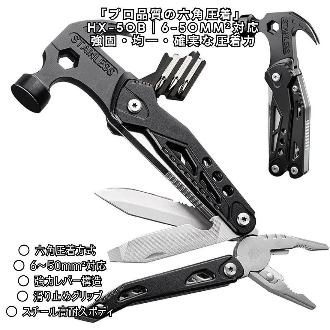 ■ 商品名 圧着ペンチ 六角圧着工具 Model:HX-50B ■ 商品概要 本製品は、ケーブル端子の確実な圧着を実現する 六角圧着方式(Hexagonal Crimp) 採用のプロ仕様ツールです。 6〜50mm / AWG10〜0 の幅広い電線サイズに対応し、バッテリーケーブル、ラグ端子、配電盤、DIY電装作業などに最適です。 ■ 主な仕様 ● モデル:HX-50B ● 圧着範囲:6-50mm ● 対応AWG:10-0 AWG ● 全長:約390mm ● 六角圧着方式採用 ● 人間工学グリップで握りやすく安定作業 ● ケーブル端子・チューブ端子・ラグ端子に対応 ● 高耐久スチール構造 ● しっかり圧着できる強靭トルク ■ 商品の特徴 ● ● 六角圧着で強固・均一な仕上がり ● ● 6〜50mmまで幅広く対応 ● ● DIY〜プロの電装作業まで使用可能 ● ● ケーブル焼けや接触不良を防ぐ高精度圧着 ● ● 大型レバーで軽い力でも強圧着 ■ 主な使用シーン ・自動車/バイク ・ソーラーパネル配線 ・電装DIY ・バッテリーケーブル製作 ・オーディオ配線 ・船舶、農機具 等 |