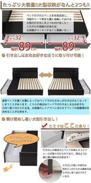 | 商品紹介 | + ダブルマットレス ○大人気のベッドシリーズ!! 【ベッド】 ●ベッド下に大型の引き出しが2つ設置されています。 ●ヘッドボードには電源コンセントを2個口、側面収納を完備。 ●桐を使用したすのこを採用し、通気性も◎。 ●素材:MDF(ベッド本体) 桐(すのこ) ●塗装:PU塗装 ●電源コンセント(2個口):合計で1500ワットまで使用可。 ●電源コンセント用プラグが1本(長さ約176cm)付属。 ●重量:約84kg 【マットレス】 ●ファイバー・ウレタンフォーム・ラテックス・フェルト・ポケットコイルなどの贅沢な8重構造でピロートップになっているマットレスです。とても肌触りもソフトで、快適・適度な弾力性のマットレスです。 ●天然ラテックスを使用しており、体にも優しくフィット!! ●682本のポケットコイルを使っており、体に適度にフィットする機能を持ち、疲れた体を十分にほぐしてくれます。 ※こちらの商品は、組立て式です(組立てに必要な工具は付属しています)。 |