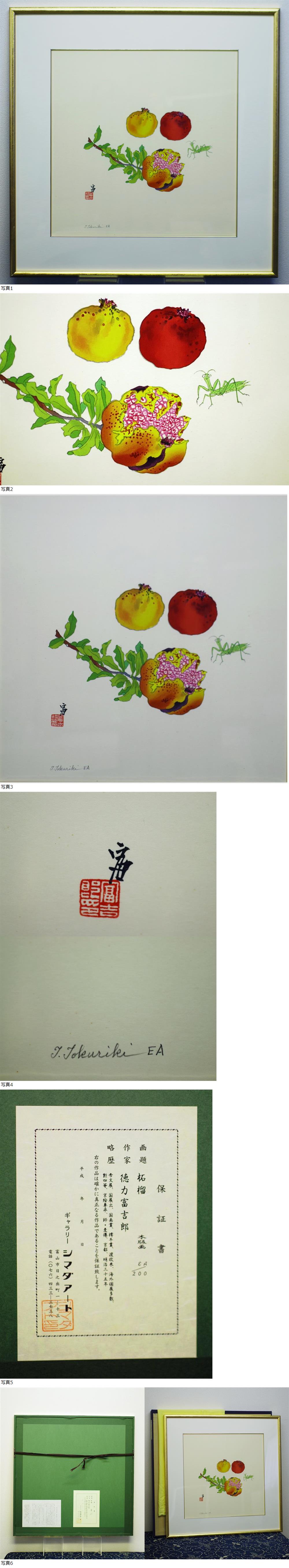 ☆★旧年中は大変お世話になりありがとうございました★☆ 本年もよろしくお願いいたします ☆★入札の取消し・落札後のキャンセルは 一切出来ません。 良くご確認の上入札して下さい。★☆ ☆★落札後2日以内のご連絡と、5日以内の ご決済をお願い致します。★☆ ☆★商品を受け取りましたら必ず《受取連絡》の クリックをお願い致します。★☆ クリックをして頂けない場合は、 以後の入札をお断りいたします。 ☆★《悪い》の評価が二桁ある方につきましては 予告なく入札制限と入札の取り消しをさせて 頂く場合がありますのでご容赦ください。 ☆★商品を確実にお届けするため、取引ナビにて 電話番号の記載をお願いいたします。★☆ ☆★再配達を避けるため、配達日・時間帯指定の ご協力をお願い致します。★☆ ☆★領収書の発行可能ですが、必ず取引ナビの 最初にご連絡ください。 インボイスには対応しておりません。 商品発送後の発行に関しましては、 切手代110円を申し受けます。 いつもアクセス頂きまして誠にありがとうございます。 すべて最低落札価格無し! 100円スタートと致しますので奮って入札して下さい。 この木版画は徳力富吉郎の作品で、 タイトルは『石榴』です。 壁面を優雅に演出してくれる素敵な作品です! 是非コレクションの一枚に加えて下さい! ☆★☆当店の出品ポリシーについて☆★☆ 当店出品の作品につきましては、美術年鑑での 評価額などにとらわれず、極力描きこみの良い物・ 埋もれさせたく無い現存・物故作家を中心に 出品しております。 (勿論、人気作家の出品もあります) また、作品は直ぐに飾って頂けるようガラスを外して 裏表を綺麗に拭き上げる(構造的に外せない物は表面のみ) のは勿論の事、外枠のクリーンナップや金具・ 吊りヒモの補修・交換などを施した後、 しっかりと梱包の上発送しております。 最近は赤字での落札も沢山ありますが、 これからも落札者の立場に立った出品を心がけてまいり ますので、ご愛顧のほどよろしくお願い申し上げます。 他の入札者のご迷惑となりますので、一円単位でのご入札、 入札後のキャンセルはご遠慮願います。 ☆★☆出品作品は全て真筆・真作保証いたします。☆★☆ 万が一贋作の場合、落札代金+送料をご返金 させて頂きます。 落札後、異議申し立てされる場合、物故作家の場合は、 公的または所定鑑定機関発行の鑑定書・証明書、 あるいは作家のご遺族による所見を記した 署名・捺印・日付のある書面をご提出いただきます。 現存作家の場合、作家自身の署名・捺印・日付のある 書面を御用意の上申し立て下さい。 異議申し立ては、落札後一か月以内とさせて頂きます。 ★☆なお、鑑定にかかる交通費や鑑定料などの 費用につきましては、お客様のご負担となります。☆★ 作品欄/額縁欄の☆印について 1/2は☆半分です ☆☆☆☆☆ 新作及び描きおろし/新品額装 ☆☆☆☆ 新品同様品/微かな擦れがある新品同様額 ☆☆☆ 汚れ・傷みの無い美品/若干の擦れのある額縁 |