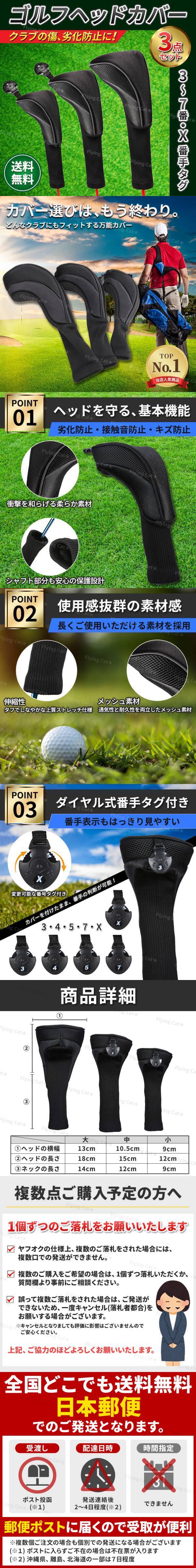 | 【匿名配送】ゴルフクラブ ヘッドカバー ブラック3点セット!ダイヤル式 番手タグ付き ■シンプルなデザイン 他のセットにも合わせやすい単色でシンプルなデザインを採用しました。 また、クラブの形状にフィットする立体縫製、クッション性のある肉厚な生地でしっかり保護します。 ■シャフト部分までしっかりガード ネック部分が長いロングネック計上。ネック部分は伸縮性のあるナイロン生地を使用。 ヘッド内側は柔らかいナイロン素材により衝撃からクラブを保護します。 ■ダイヤル式 番手タグ付き ダイヤル式で簡単に番号の変更が可能です。 カバーを付けたままでも番手の判断ができ利便性も上がります。 ■撥水性 水濡れや汚れに強いから、小雨が降っても大丈夫。汚れても水拭き可能です。 |