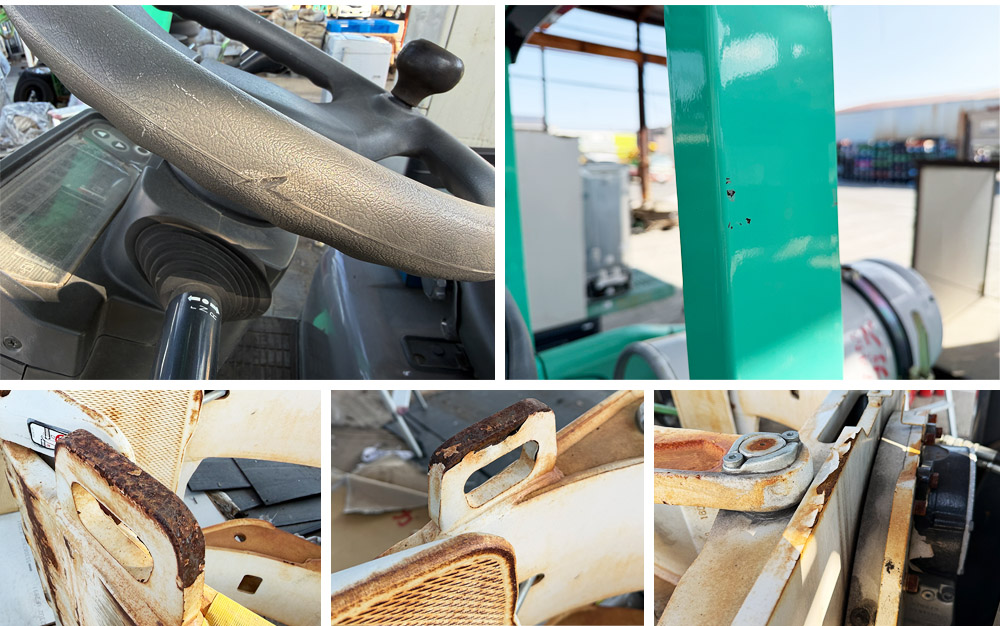 アタッチメント付きフォークリフトが入荷致しました。 全体的にキズや汚れ、テープ跡、錆付きなどの使用感がございます。 また、タイヤにはひび割れが多く見られます。 動作は良好ですのでご使用に問題はありません。 移動等で稼働時間に多少の増加がございますので予めご了承ください。 その他、詳しい商品状態につきましては写真でのご確認をお願い致します。 YouTubeで動作確認の動画を公開しております。 よろしければ参考にご視聴くださいませ。 >>動作確認動画はこちらをクリック<< 大型商品のため直接引取り限定としておりますが、 配送可能な地域もございます。 配送の可否やお見積り等を致しますのでお問い合わせください。 この機会に是非ご検討宜しくお願い致します。 【詳細】