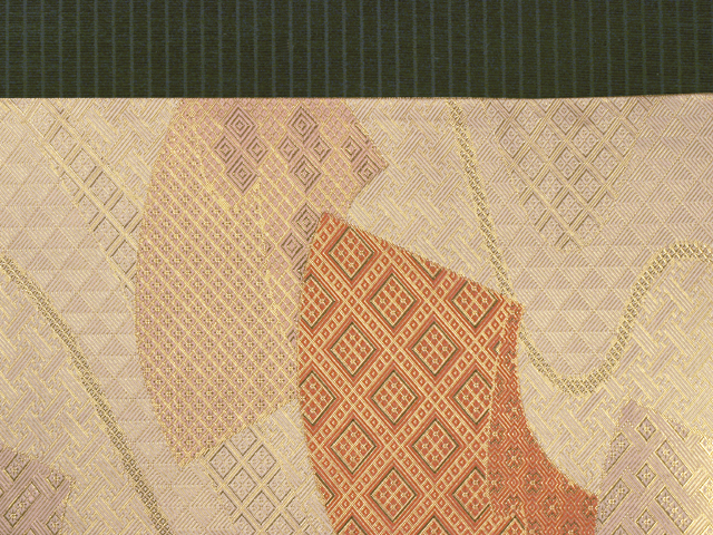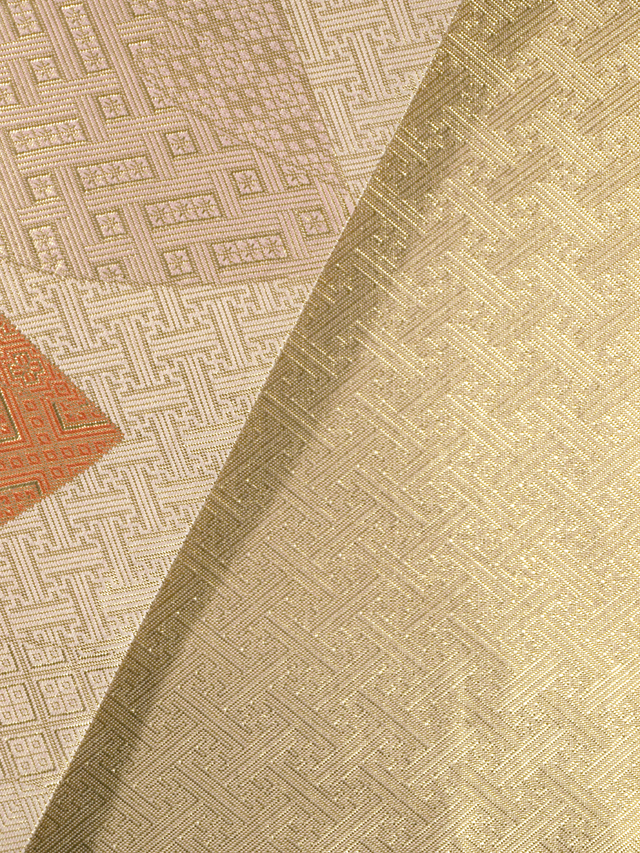 全体的な印象としては練(ねり)色といった感じの地に、さまざまな小紋流が配された流水と地紙の文様が織り込まれている本場筑前博多織の佐賀錦の袋帯です。 とても優美で品よく、完成度の高い意匠で、伝統文様の格調の高さも人を選ばない印象です。廃れてしまった佐賀錦は、近年では博多織の機屋さんが積極的に織るようになっています。現在の本場筑前博多織の最上位の金証紙にあたる銀証紙(一世代前の証紙の最上位)がたれの折り返し内側に貼られています。帯芯は入れられていないので、軽めの帯がお好みの方におすすめです。 ユーズド品で、前の折り跡とうっすらとした結びじわがわずかにありますが、使用感はあまり感じられません。目につくしみやよごれ、褪色などのダメージは見あたらず、きれいな状態です。 |