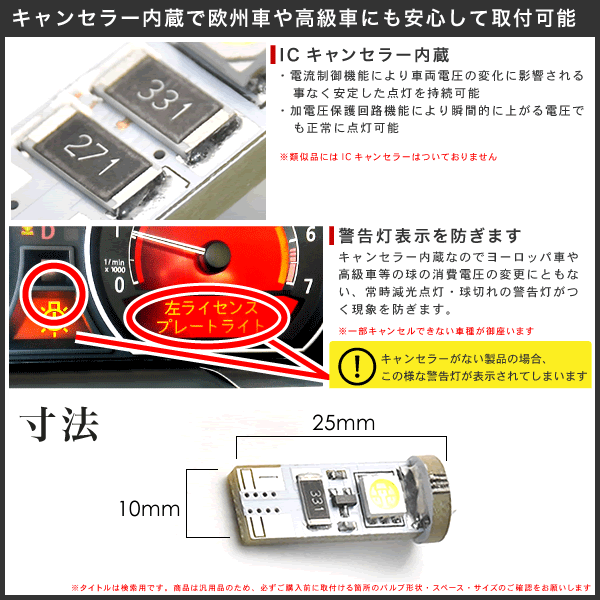 | 存在感ある純白色の輝き!! 高輝度SMD LED仕様のポジション+ナンバー灯セット! ■ICキャンセラー内蔵で球切れ警告灯が付きません! 販売されているLED球にはICキャンセラーが付いてない事が多いですが、 本製品では安心して純正球と交換して頂く事が可能です。 ■高輝度SMD LED仕様 純正ランプとは全く異なる純白色の輝きは車内の雰囲気を一変。 【確認事項】 ※タイトルや適合は車種と適合の一部を掲載の為、必ずご購入前に現車にてご確認下さい ※必要本数は車種・グレードにより異なる場合があります ※車両適合の最終的な判断はお客様でお願いします ※車検非対応ですので純正球は必ず保管して下さい ※警告灯を防ぐICキャンセラーを内蔵しておりますが、社外品のため絶対保証ではありません。ご了承下さい |