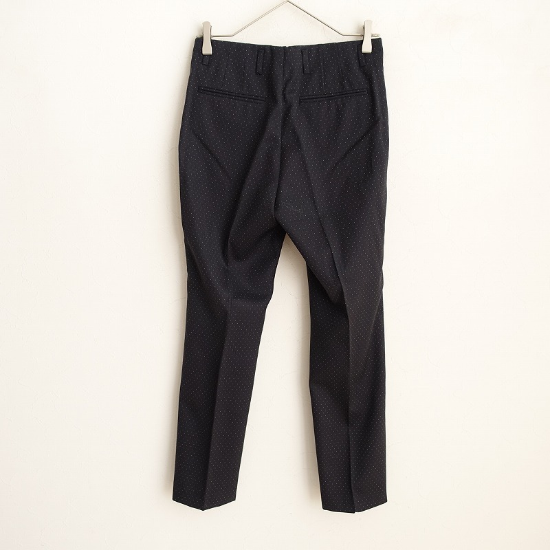 | DRIES VAN NOTENのウールドットパンツです。カラーはネイビーにベージュのピンドット柄で、薄手のウール素材です。ホック・内ボタン&ジッパーで着脱でき、前腰左右&ヒップ左右にポケットがございます。 |