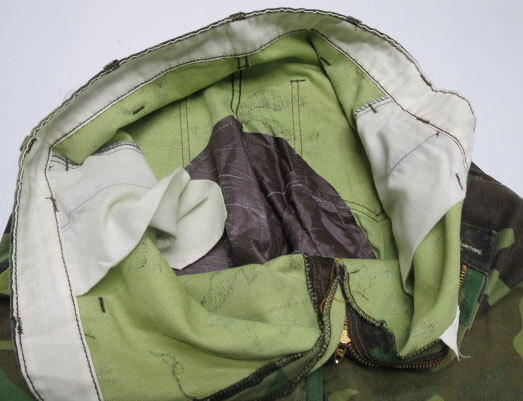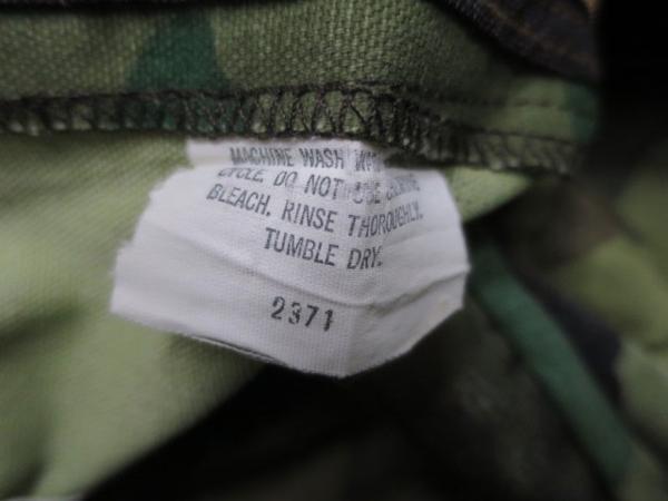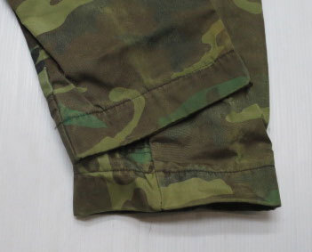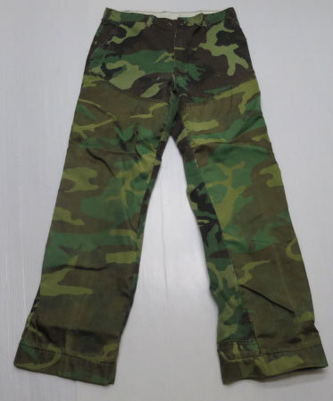 アメリカ買い付けの80年代頃ダブルニーウッドランドカモ柄のパンツで素材は表記不明ですが恐らく綿で前面太腿付近より裾までナイロンの2重貼りで内装のお尻も2重貼りのTALON製ZIPです。