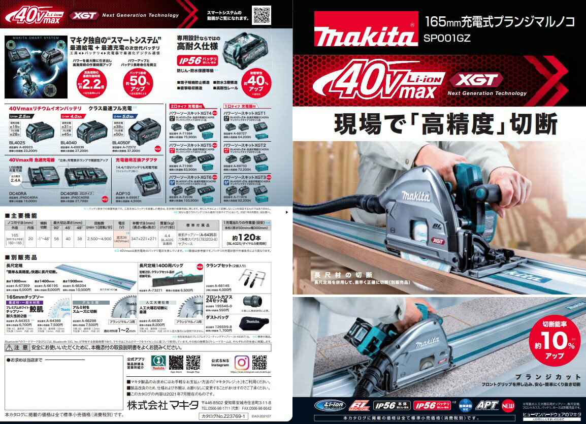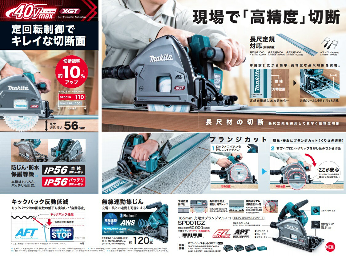 マキタ makita165mm 充電式プランジマルノコSP001GZ本体+鮫肌プレミアムホワイトチップソー付88381749305■長尺材の切断に■専用設計なので、簡単・高精度■プランジカット(くり抜き切断)に1.ロックオフボタンを押し、スイッチオン2.前方へフロントグリップを押しながら切り込み■定回転制御でキレイな切断面■粉じんや雨から保護、防じん・防水保護等級IP56※本機はもちろん、バッテリも対応。※粉じんや水による影響を受けにくいように設計されていますが、故障しないことを保証するものではありません。■キックバックによる反動低減キックバック発生による急激な回転数低下を検知して停止。※注意:本機能はキックバックそのものを防止するものではありません。■無線連動集じん■刃物位置目印付■毛羽立ち防止溝付けストッパ■傾斜させても切断位置は一定■スピードダイヤル付■傾斜ポジティブストップ(22.5°・45°)■回転式ダストノズル■サブベース付■その他特長・ハイパワーブラシレスモータ搭載・防滴・防じん「アプト」・鮫肌プレミアムチップソー付・ソフトスタート・ブレーキ付マキタ makita