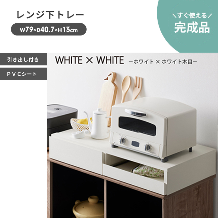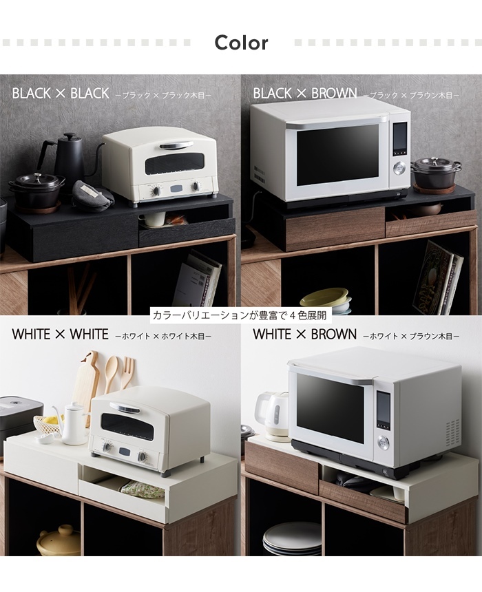 | レンジの下にちょこっと置きと収納をプラス出来る引き出し付レンジ下トレー。 トレーは必要な時だけ引き出せて、ご飯の取り分け・料理スペース・一次置きなどの作業スペースに◎ スライドテーブルは約30cm前方へ出て、ひろびろしたスペース。 引き出しは必要なキッチン用品などをすっきり収納出来ます。 フルスライドレール採用で出し入れスムーズ。 ブラック・ブラック×ブラウン・ホワイト・ホワイト×ブラウンの4色展開。 |