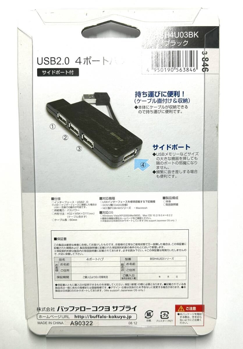 | USB2.0、 4ポートハブ、バスパワータイプ: BSH4U03BK 1個組 新品未使用品 | |