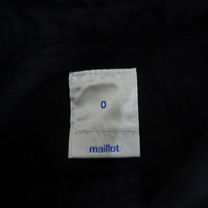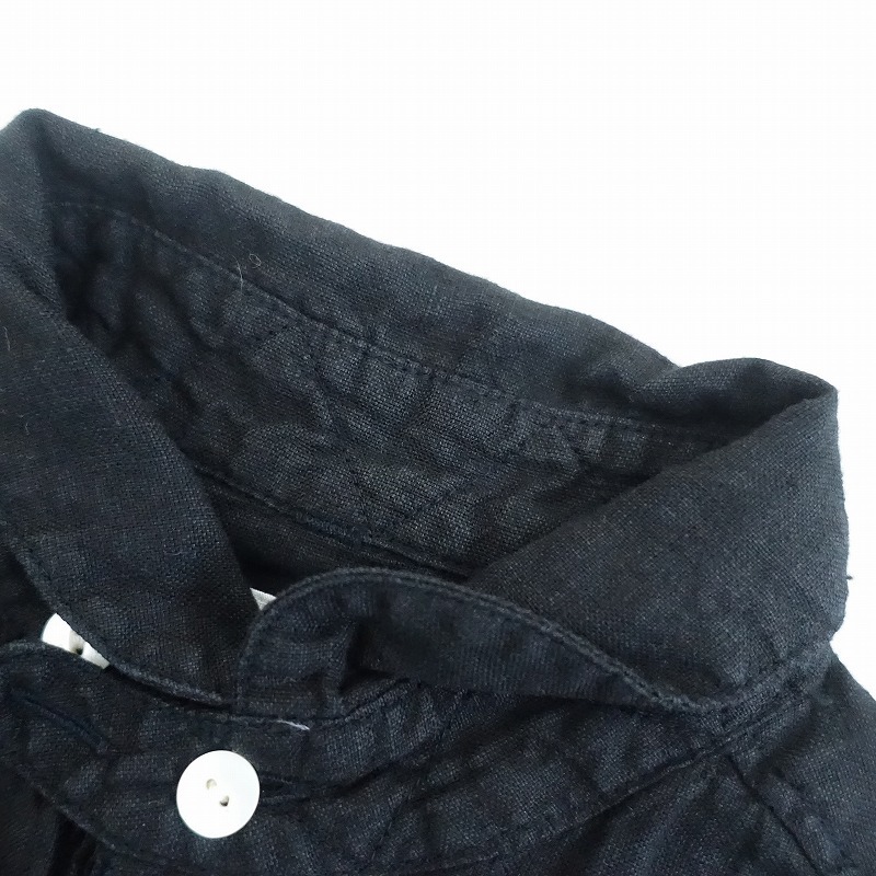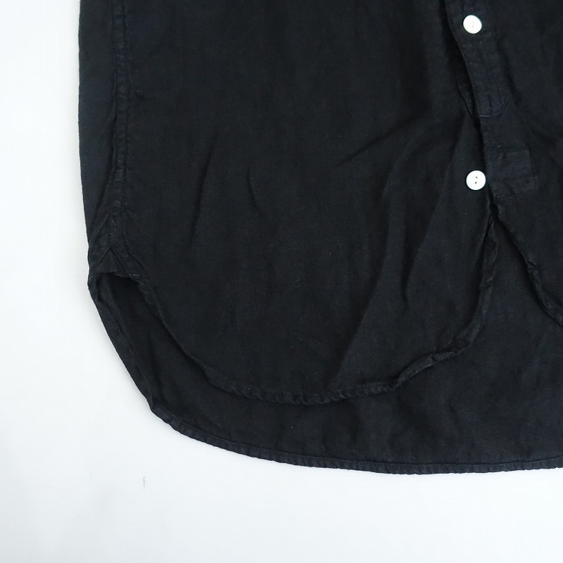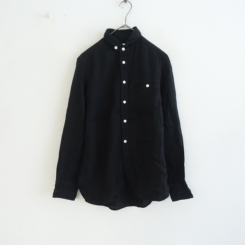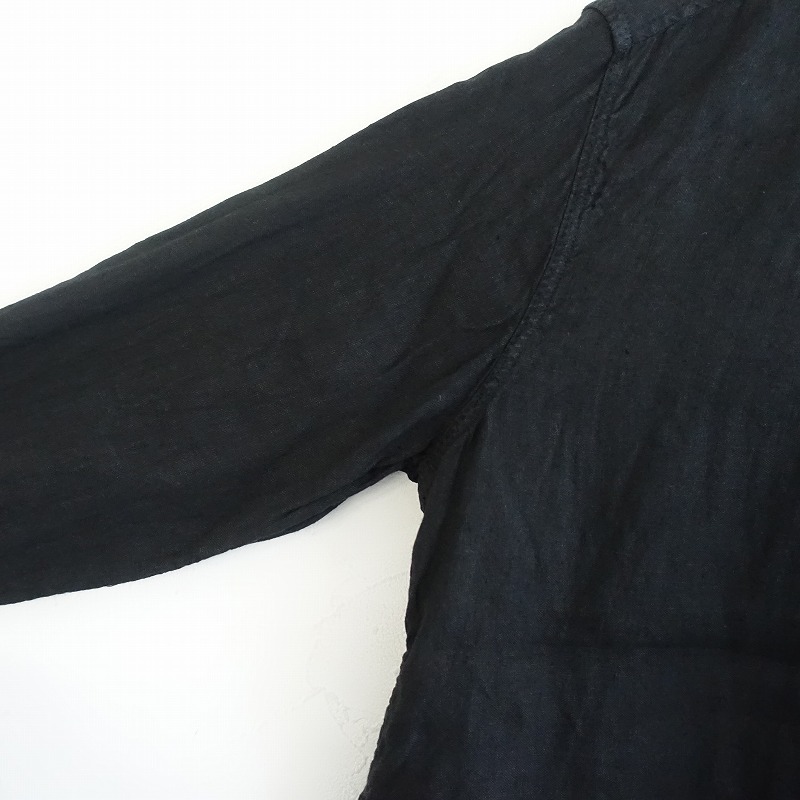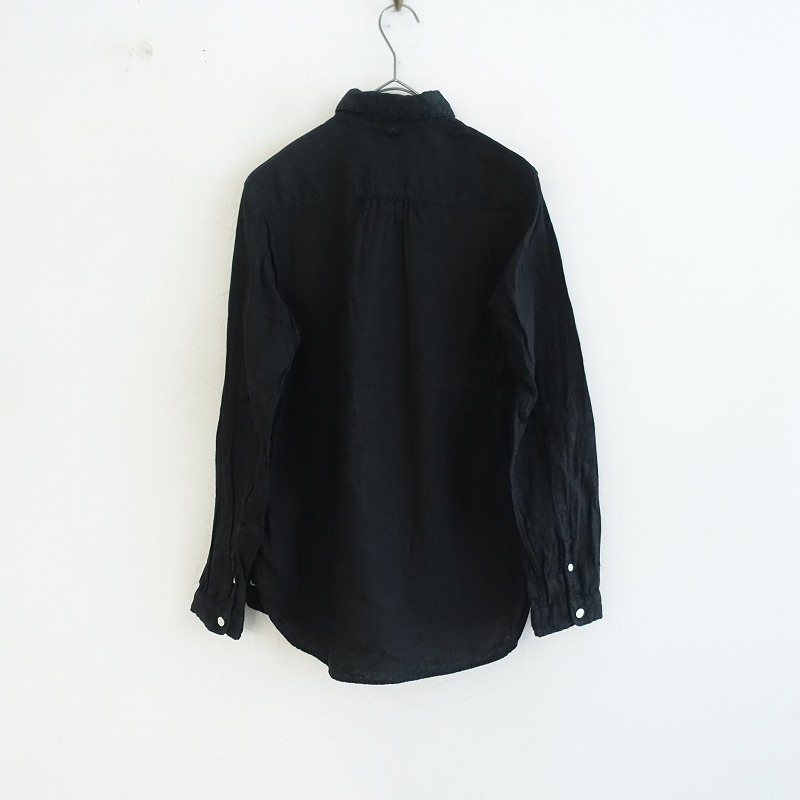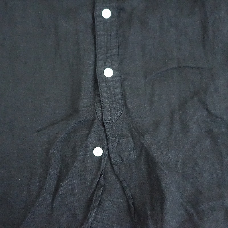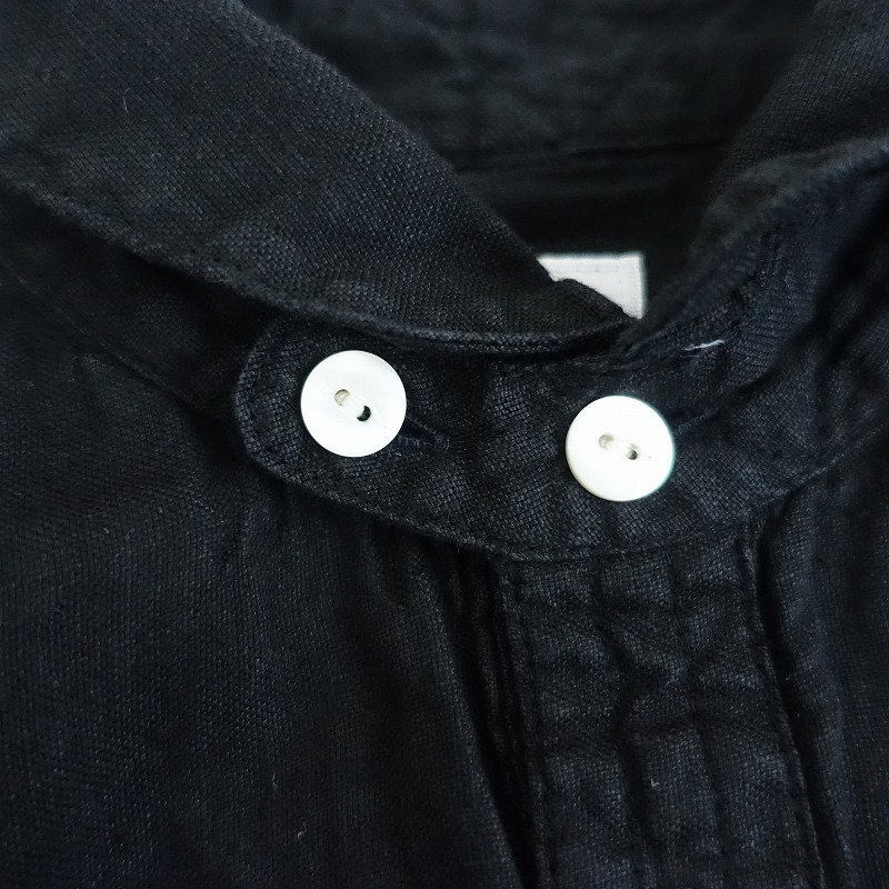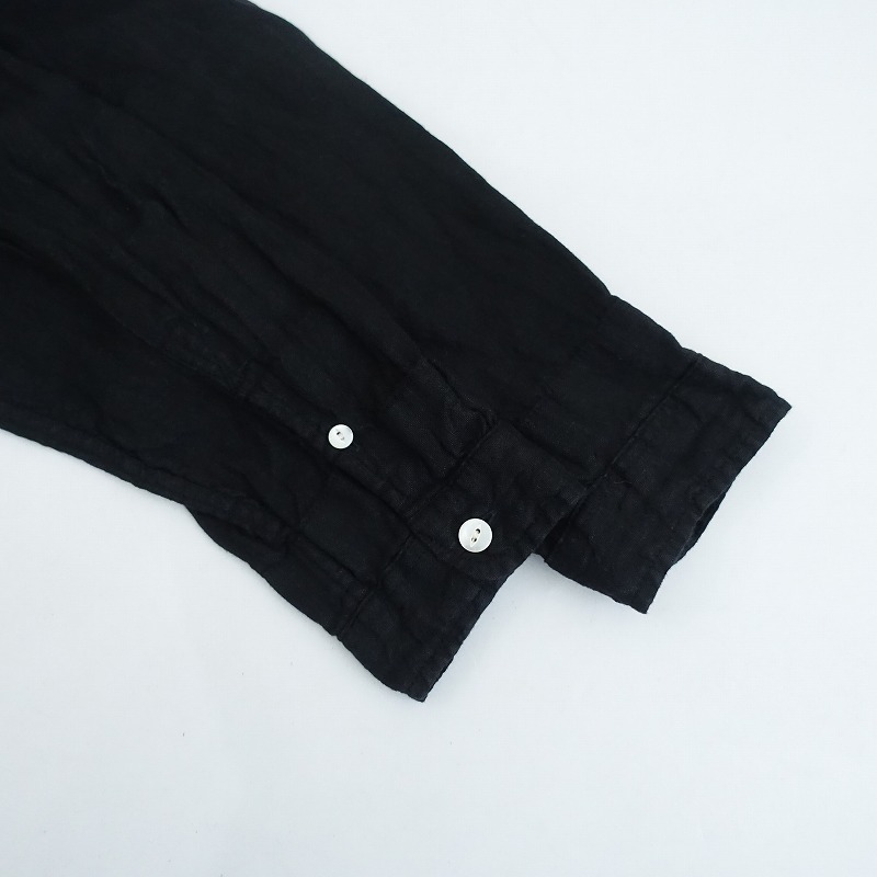 | maillotのリネン長袖シャツです。カラーはブラックです。小さめの襟のデザインで、フロントボタン開閉で着脱でき、左胸にポケットが付いております。 |