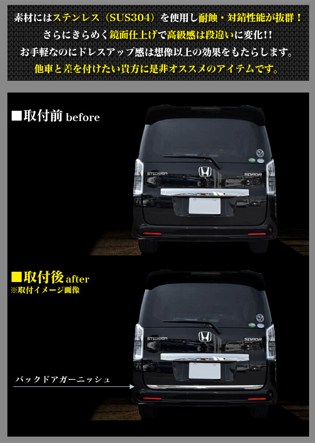 | ■ステップワゴン RK系 前期/後期 スパーダ可 H21.10〜現行 ■ステンレス&鏡面仕上げ ■両面テープ装着済み ■バックドアガーニッシュ 1P |