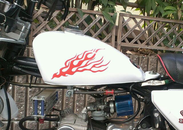 ファイアーパターンのカッティングステッカーを製作しました。2枚セットになります。 裏の台紙を剥してヘルメットやボディなど貼り付けると色の付いたステッカー部分のみが残ります。 バイクや車のボディ、ヘルメットなどに貼り付けてもCOOLな印象になると思います。 素材となるステッカー素材は日本で製造されるものの中で最も耐久性の高いものを採用しましたので屋外はもちろん、水中(船など)でも使用可能です。 色は3番目の画像の通り、ホワイト、ブラック、レッド、イエロー、ゴールド、シルバー、グリーン、ブルーなど色々対応可能です。 標準サイズは20.0cm×8.0cmですが、ご要望に応じてサイズ変更致します。。 送料は標準サイズ(20.0cm×8.0cm)が普通郵便で110円、それ以上のサイズは定型外郵便となり140円~180円になります。 |