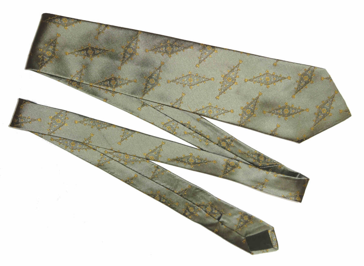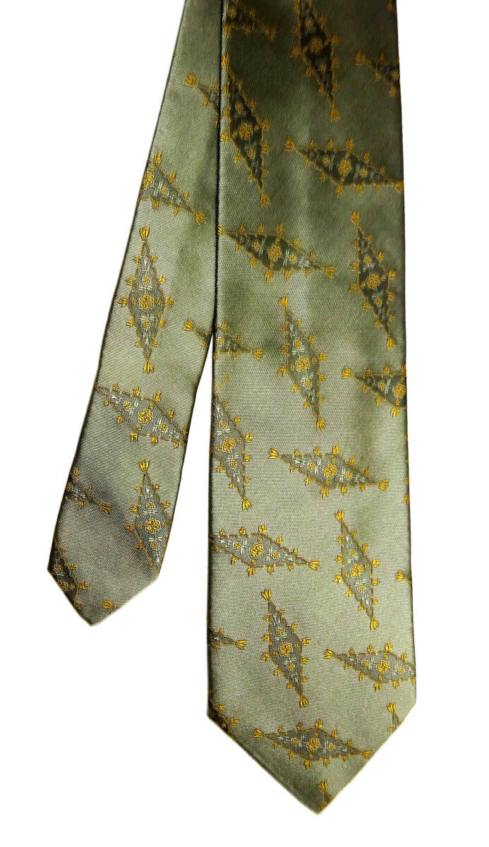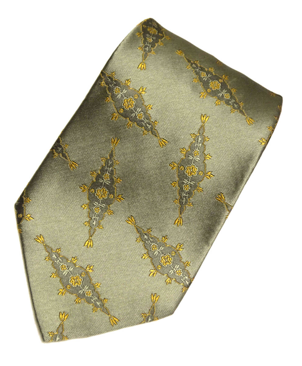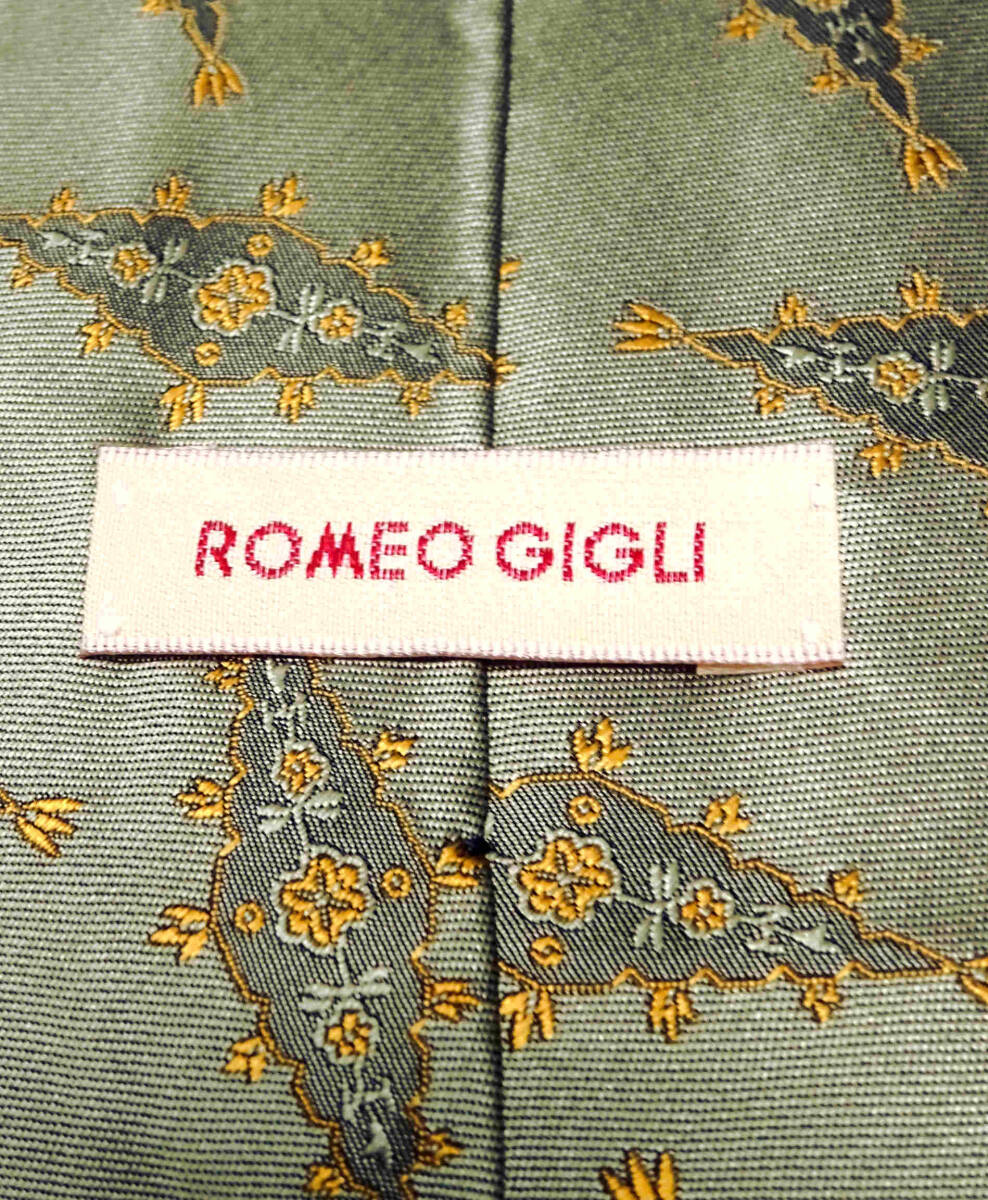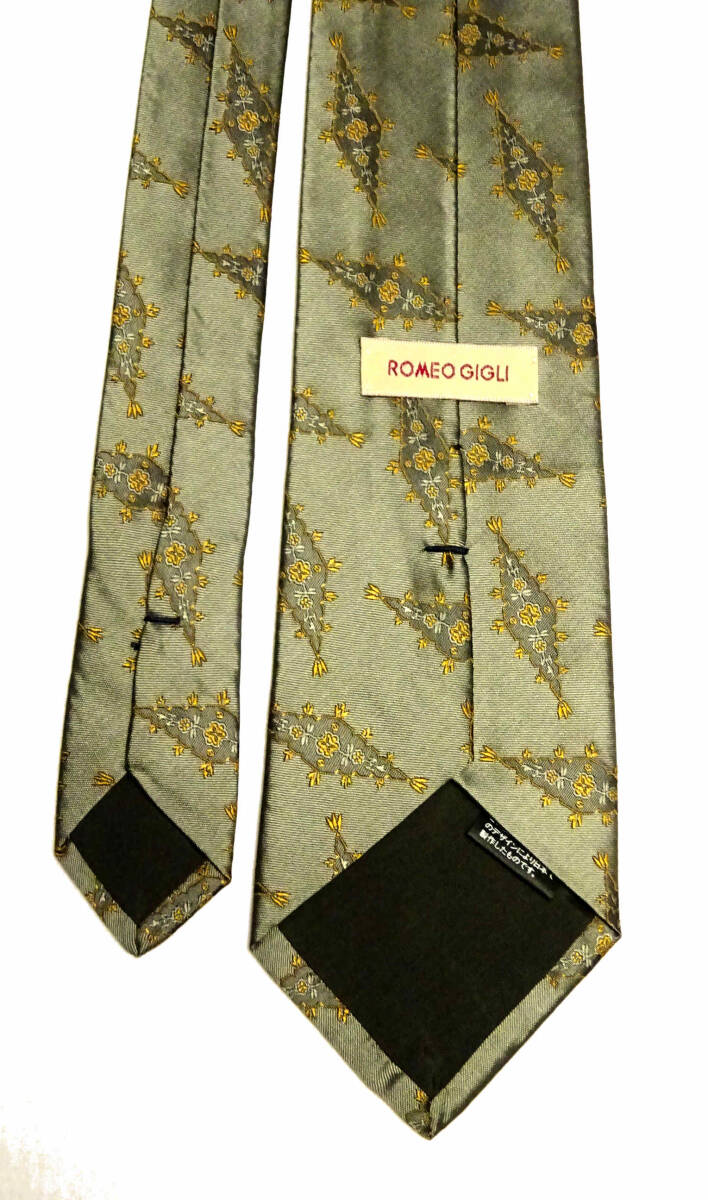 | タイトル | ●ROMEO GIGLI ロメオジリ / デザイン:イタリア・製作:日本・シルク・ネクタイ・ウグイス色地・ひし形模様(ゴールド、シルバー)・総柄 / USED |