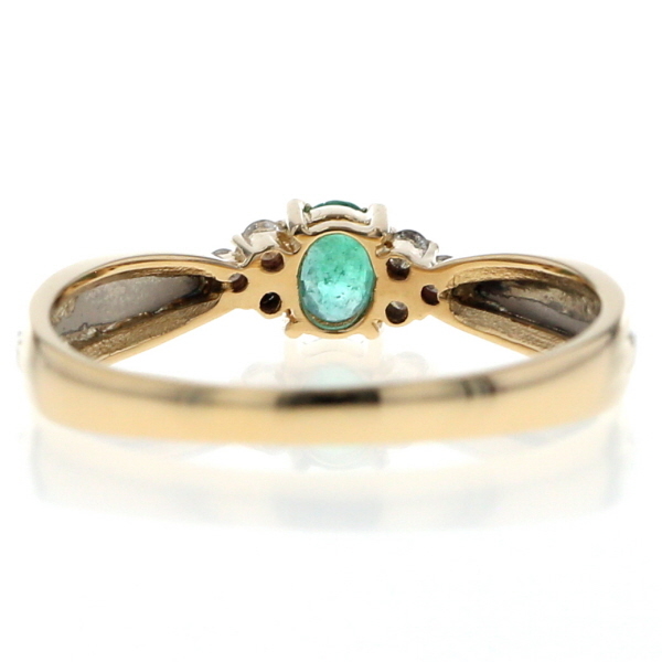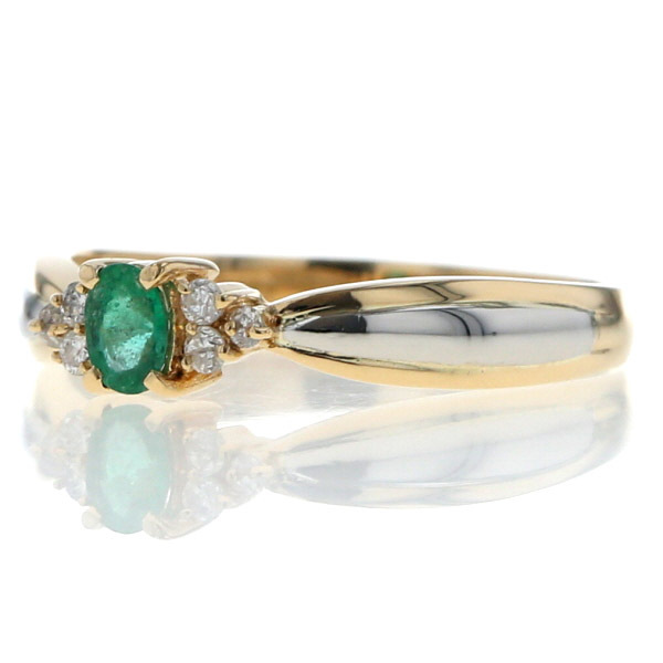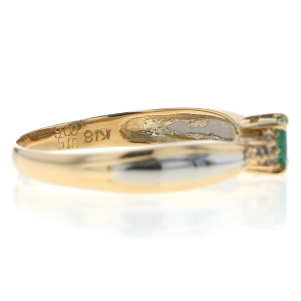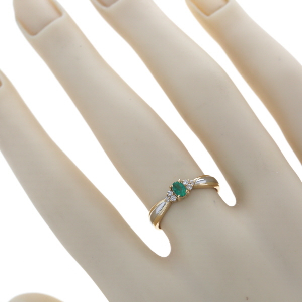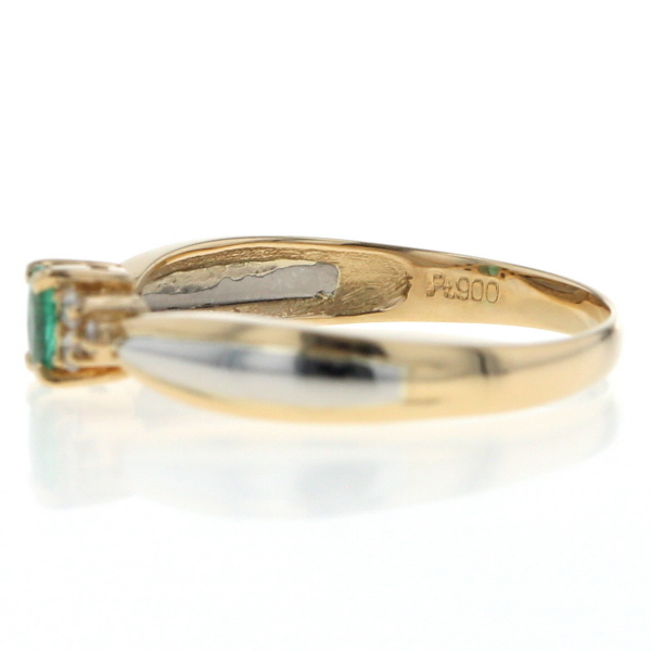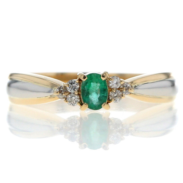 | 商品紹介 | 美しいグリーンのエメラルドを中央にあしらった、イエローゴールドとプラチナのコンビリングです。 サイドにはダイヤモンドがさりげなく煌めき、エメラルドの鮮やかな色合いを一層引き立てます。 指元にエレガントで上品な印象をプラスする、洗練されたデザインのジュエリーです。 |