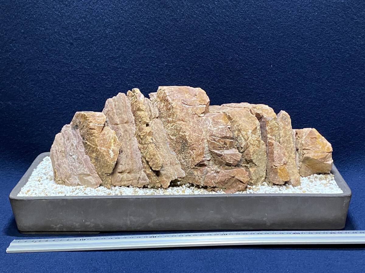 この品は、名栗川石による割れ目入りの大型鑑賞石で、鉢に据えられた状態で横幅約49cm、重量約5kg。水石・盆石・盆景・盆栽石としての鑑賞性が高く、自然景観を象徴する造形が魅力。