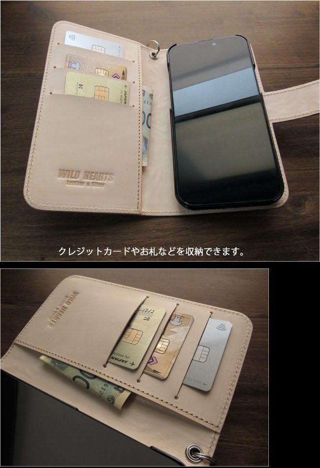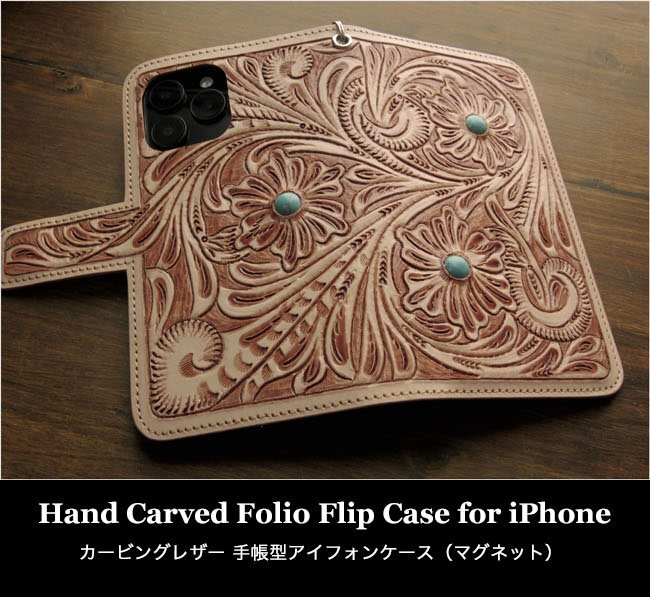 本革を使用したiPhone用手帳型ケースです。サドルレザーを使用し、その上から手彫で花柄カービングをあしらっています。
