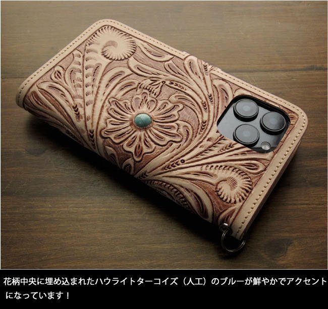 iPhone 16 本革 iPhoneケース 手帳型ケース カービング ハンドメイド 本革 タン ナチュラル ターコイズ マグネット スマホケース [浏览原始页面]