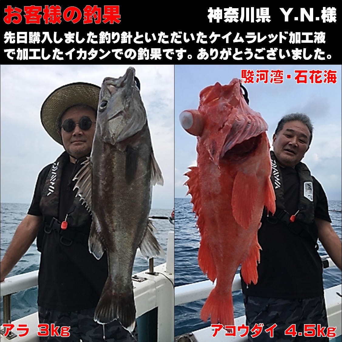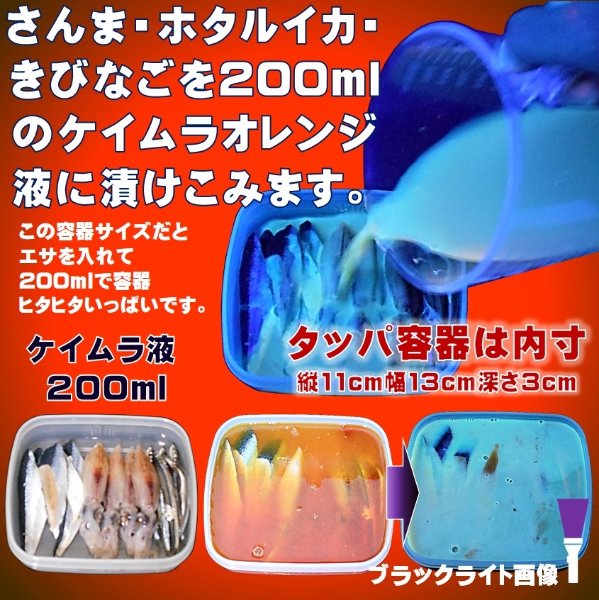 集魚剤 つけエサ用 紫外線 ケイムラ 蛍光発光 加工液は、オキアミ イカ サバ サンマ イワシ ホタルイカ カツオ きびなご イソメ アサリのむき身などの つけエサに浸すことにより 紫外線加工 ケイムラ加工でき、水中で つけエサを 紫外線発光させるための液体です。
