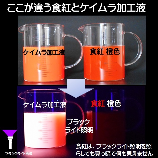 ※注 食紅とは全く違います。食紅は紫外線に発光しません。