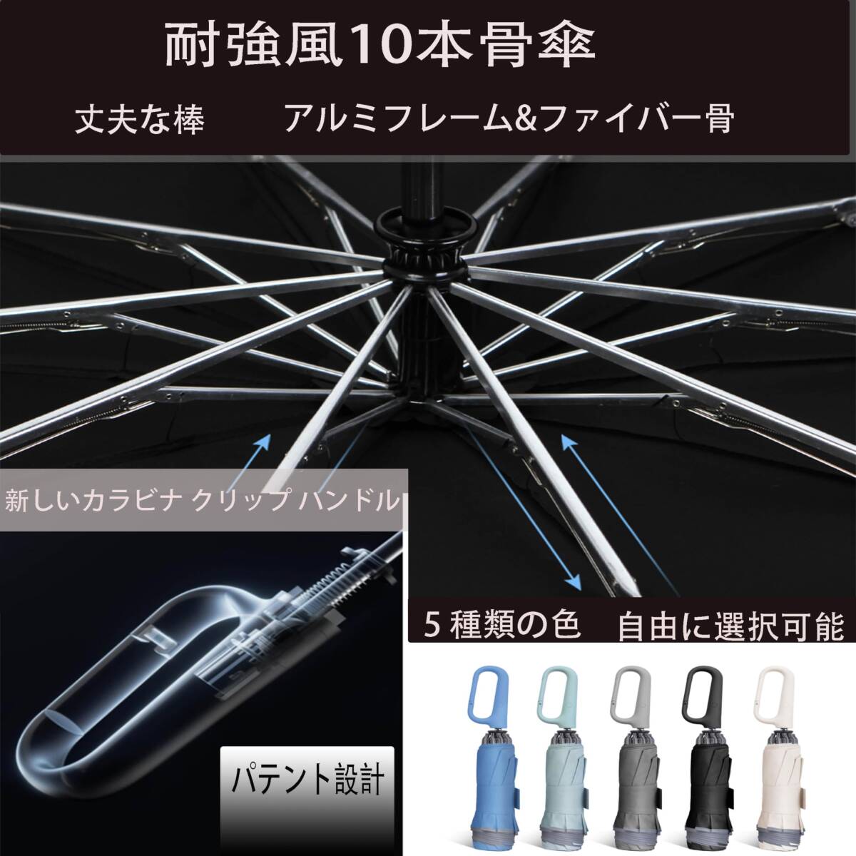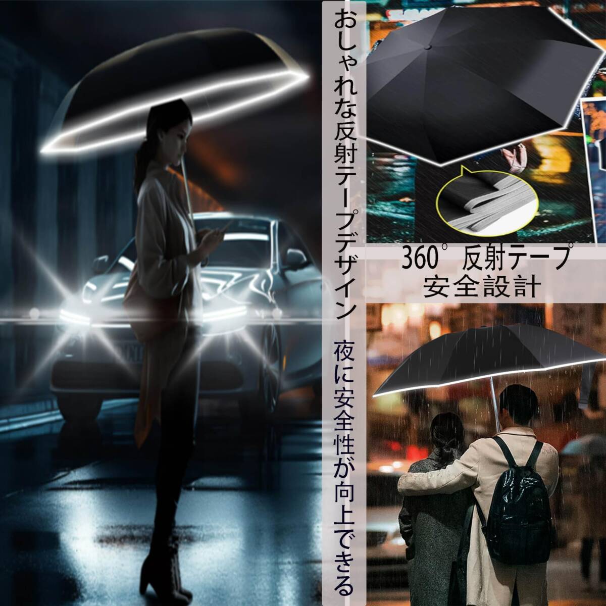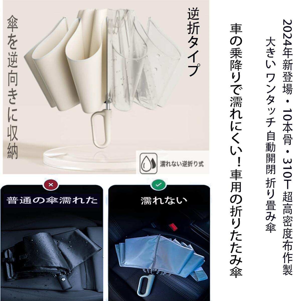 | 商品説明 | 【車の乗降りで濡れにくい!車用の折りたたみ傘】車の乗り降りでどうしても雨に濡れてしまいませんか?この折りたたみ傘をお使いいただくだけでそのお悩みが解決します。サッと車に乗り込んでドアを閉める瞬間にワンタッチで傘を閉じて車内へ、車の床に押し付けてカチッと音がするまで中棒を縮めます。降りる時にはドアを少しだけ開けたらすぐにこの折りたたみ傘を外に出してワンタッチで開きます。今まであんなに雨に濡れていた車の乗り降りが嘘のように濡れにくくなる車用の折りたたみ傘です。 「2024年新登場カラビナハンドル自動傘」パテント設計ハンドル、丈夫なスナップ傘をバックパック、荷物、ハンドバッグ、ベルトループ、ゴルフバッグ、ベビーカー、自転車でなど、さまざまな場所にクリップすることができる、最大の魅力は省スペースです。 「反射テープ付き 折畳み傘 」傘のエッジ部分に360°反射材料で加工され、大雨の天、霧の天、雨夜でも安心安全に歩ける反射テープ付きの 折りたたみ傘 です。車からの視認性が高まり、ドライバーは夜道や雨の多い道で歩行者を見つけやすくなり、安全性が向上します。男女を問わずシンプルなデザインで、通勤や通学、夜残業の多いサラリーマンや夜に出かける方にもおすすめの おりたたみ傘 。 「カラビナハンドル逆折タイプ&ワンタッチ自動開閉傘」折りたたんだ時、雨に濡れる面が内側になる逆折タイプの構造です。これにより使用後に傘を折りたたんでも濡れることなく折りたたむことが可能。手元のボタンをワンタッチで自動開閉できるので、逆折機能と合わせて雨の日に車に乗車する時や降りる時に濡れにくくなり、車内が雨でベタベタになる心配もありません。普段、車やバス、電車など乗り物に乗って移動される方の心強い機能です。(防水傘カバー 付き) 「高撥水310T生地&夜間反射テープ」310Tテフロン加工を施した高撥水高密度生地を使用、雨に濡れてもウソのように水を弾きます。使用後も傘を振るだけで表面に残った水分のほとんどを飛ばすことが可能です。付属の防水カバーに入れることで使用後すぐにしまっても持ち運ぶ際に濡れることがありません。 「丈夫な10本骨大きい折り畳み」10本のアルミニュウム合金と強化グラスファイバーを中骨に採用したことで傘曲の長さ116cm、重量:約430gを実現。強度と柔軟性を備えた強化グラスファイバーは強風時、たとえ傘が逆に反り返っても折れることなく元の形状に戻ります。強化ファイバーグラスで作られた10本傘骨は他の8骨傘よりもっと強くなっていて、6級までの強風まで耐えられる丈夫さ。 「 素材」10本骨自動開閉傘、310T超高防水密度の5級防撥水布、フレーム材質:軽いアルミフレーム&ファイバー骨、ハンドル:ABS+ラバーペイント