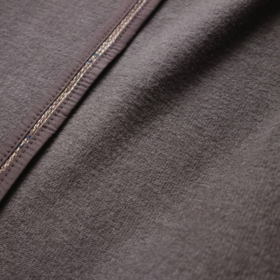 自社で生地を開発・生産しているチルコロのジャージー素材なので言うまでもなくトップクオリティです。このジャケットには、厳選されたコットン素材から紡がれた細番手糸を緻密に編み上げた後、裏起毛加工を施して保温性を高めた「FELPA(フェルパ)」という名称の秋冬用ジャージーが使用されています。一般的な裏起毛ジャージーよりも格段に滑らかなタッチで、ふっくら柔らかく、暖かく進化しているため、秋口から晩冬まで快適に着用して頂けます。厚みのわりに軽くて着やすいことも特徴です。縦、横、斜め、全方向にストレッチするので、とにかく着ていてラクチンです。いちど着ると病み付きになること請け合いです。絶妙な分量でポリウレタンが混紡されているのがポイントでして、これによって生地にキックバック性(弾性回復力)が生まれ、型崩れや肘抜けが起こりにくくなっています。安価なジャージージャケットはワンシーズンで伸びてだらしなくなってしまいますが、チルコロの品ならその心配はありません。