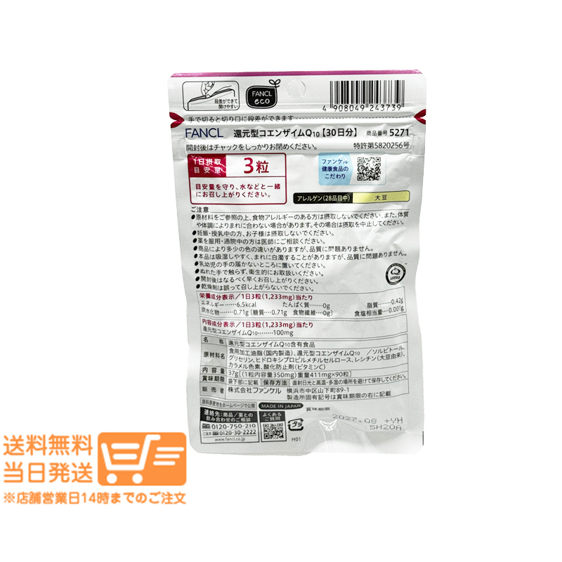 | 商品の説明 | 【特徴】 ダイレクトに働き、吸収に優れた還元型コエンザイムQ10 エネルギーやサビにアプローチし、若々しさに役立つコエンザイムQ10。 ファンケルの「還元型コエンザイムQ10」は、ダイレクトに働く還元型コエンザイムQ10に、さらにファンケル独自の「微細乳化製法」で吸収性もアップ。 中高年の方や、運動量が多くエネルギー消費が激しい方、これまでのコエンザイムQ10で実感が得られなくなった方におすすめです。 【1日の目安】 3粒 【主要成分/1日3粒当たり】 還元型コエンザイムQ10:100mg 【ご注意】 ※本品は、原材料の一部に大豆が含まれます。食品アレルギーをお持ちの方はお召し上がりにならないでください。 ※妊娠・授乳中の方、お子様はお召し上がりにならないでください。 |