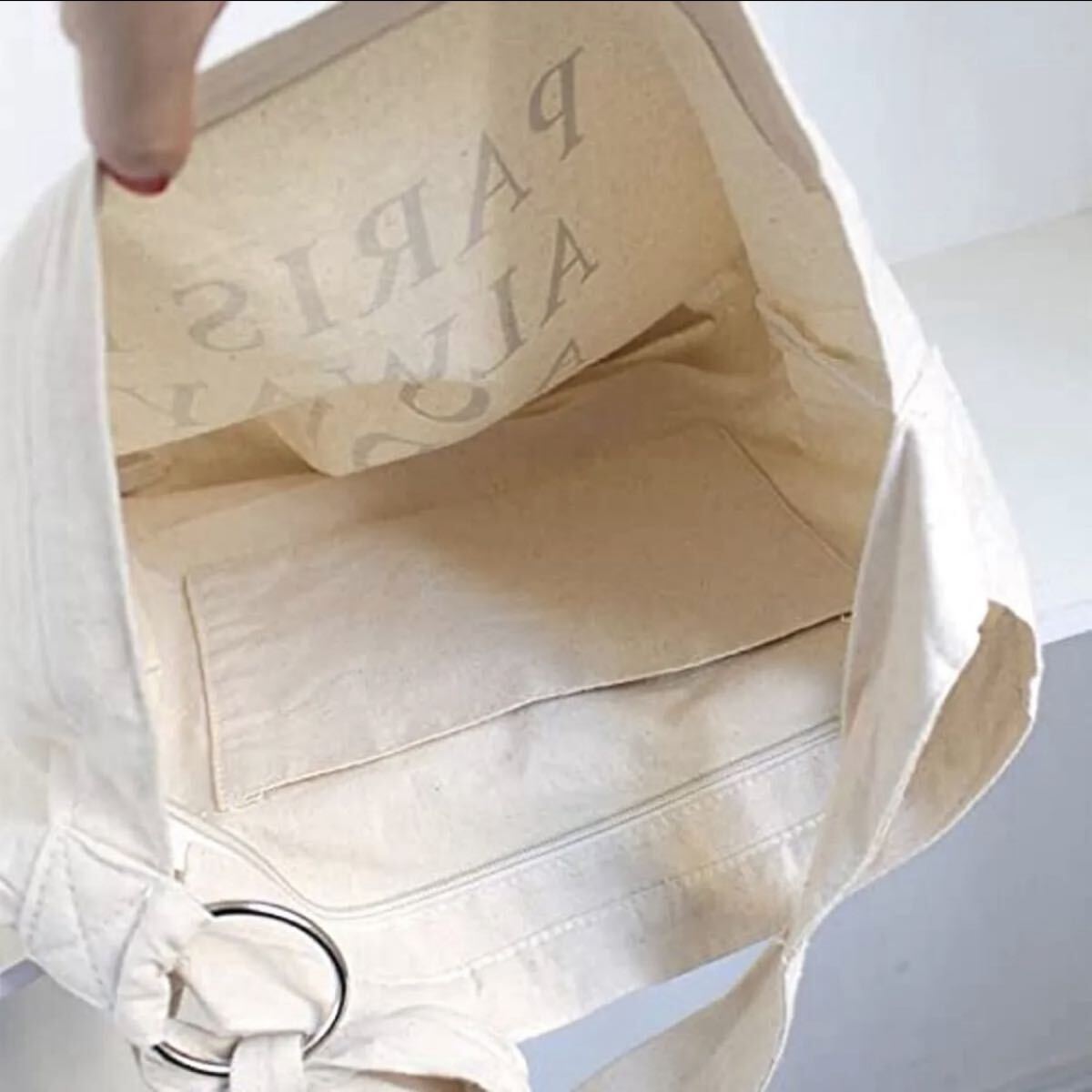 ナチュラルな帆布素材のショルダーバッグです。英字ロゴ「PARIS IS ALWAYS A GOOD IDEA」がポイント。カジュアルコーデにぴったりで、肩掛け・斜め掛けOK。軽量で収納力も抜群!