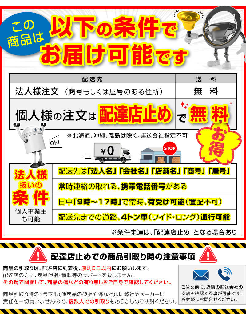 配送に ついて 【法人様宛】 | ・ご指定のご住所まで送料無料、ご注文時に屋号を必ずご入力下さい。 (北海道、沖縄、離島は除きます) ・お届けは4トン車が通行可能なエリアに限ります。 ・2階以上の階上げは行っておりません。 ・指定日配達可能です。(ただし日祝日は除きます) ・配達時間帯の指定は対応不可、午前/午後の希望を送り状に明記のみであれば可能です。(確実なお約束はできかねます。) |