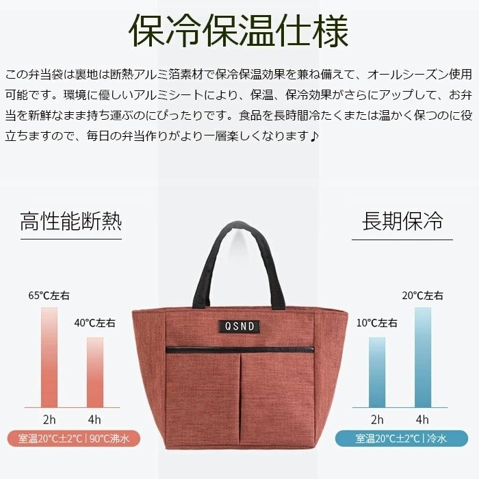 【保冷保温仕様】この弁当袋は裏地は断熱アルミ箔素材で保冷保温効果を兼ね備えて、オールシーズン使用可能です。環境に優しいアルミシートにより、保温、保冷効果がさらにアップして、お弁当を新鮮なまま持ち運ぶのにぴったりです。食品を長時間冷たくまたは温かく保つのに役立ちますので、毎日の弁当作りがより一層楽しくなります