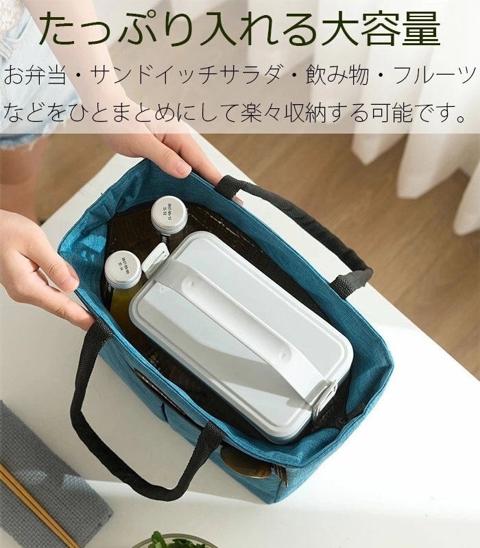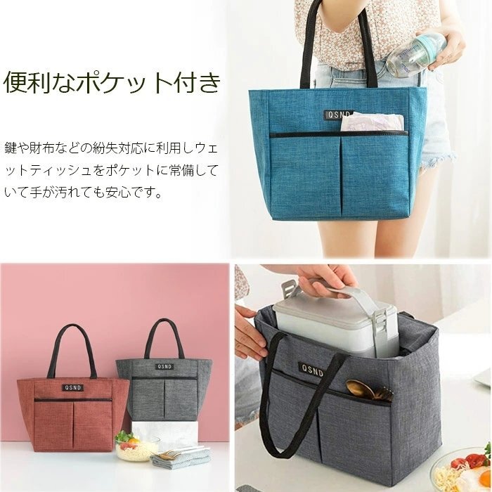【使いやすい大きさ】:おしゃれで持ち運びしやすい人気のトートバッグ型のランチバッグです。このランチバッグは3人分くらいのランチボックス、水瓶、飲料、お菓子や果物などをすべて簡単に収納できます。開け口はファスナー開閉で、大きく開いてお弁当の出し入れも楽に出来ます。外側にも小物を収納できるポケットが付きなので鍵や財布などなどの紛失対応に利用し、いい省スペースになります。またはコンビニで飲み物やランチを買う時、スーパーで一人分の食材を買う時にエコバックとして使用してもとても便利なです