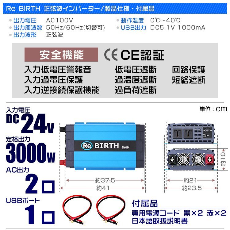 | 商品コード:C22B ■商品仕様 入力電圧: DC24V 出力電圧: AC100V 定格出力: 3000W 出力周波数:50Hz/60Hz切替 出力仕様:ACコンセント(2口)、USBポート(1口) 出力波形: 正弦波 USB出力: DC5.1V/1.0A 使用温度環境:0℃〜40℃ 本体サイズ(約):410mm×235mm×100mm 重量(約):4.4kg ショート防止保護カバー付 ■商品機能 入力低電圧警報音 入力過電圧保護 入力逆接続保護機能 低電圧遮断 過温度遮断 過負荷遮断 回路保護 短絡遮断 ■商品内容 インバーター本体 ×1 バッテリー接続コード 赤 ×2 バッテリー接続コード 黒 ×2 日本語取扱説明書 ■保障期間 7日間 ※商品到着後7日以内の初期不良・破損のみご対応させていただきます。 ■注意事項 ※ 本製品は24V車専用設計となっております 。 ※USBケーブルは付属しておりません。またUSBポートには電源供給以外の機能はありません。 ※USBハブは使用しないでください。接続機器やインバーター故障の原因となります。 ※定格出力は、すべての出力(コンセント+USB)の合計値です。 ※商品は、モニターによって色合いが異なって見える場合があります。 ※仕様・デザインは改良のため予告なく変更することがあります。 【もちろん新品未使用品です】 |