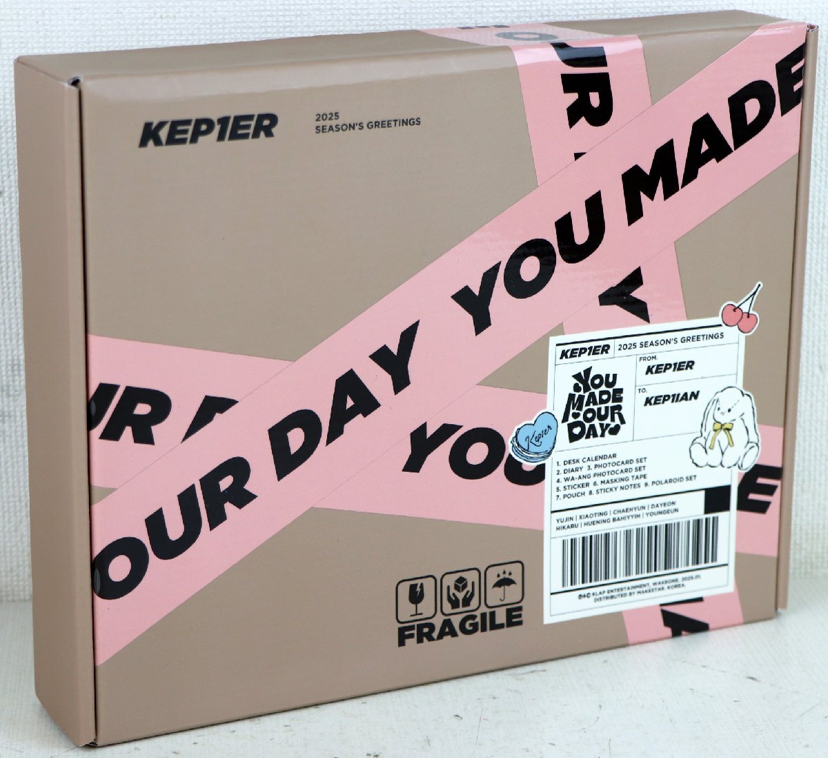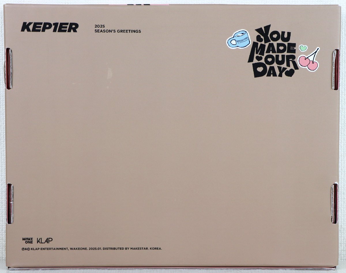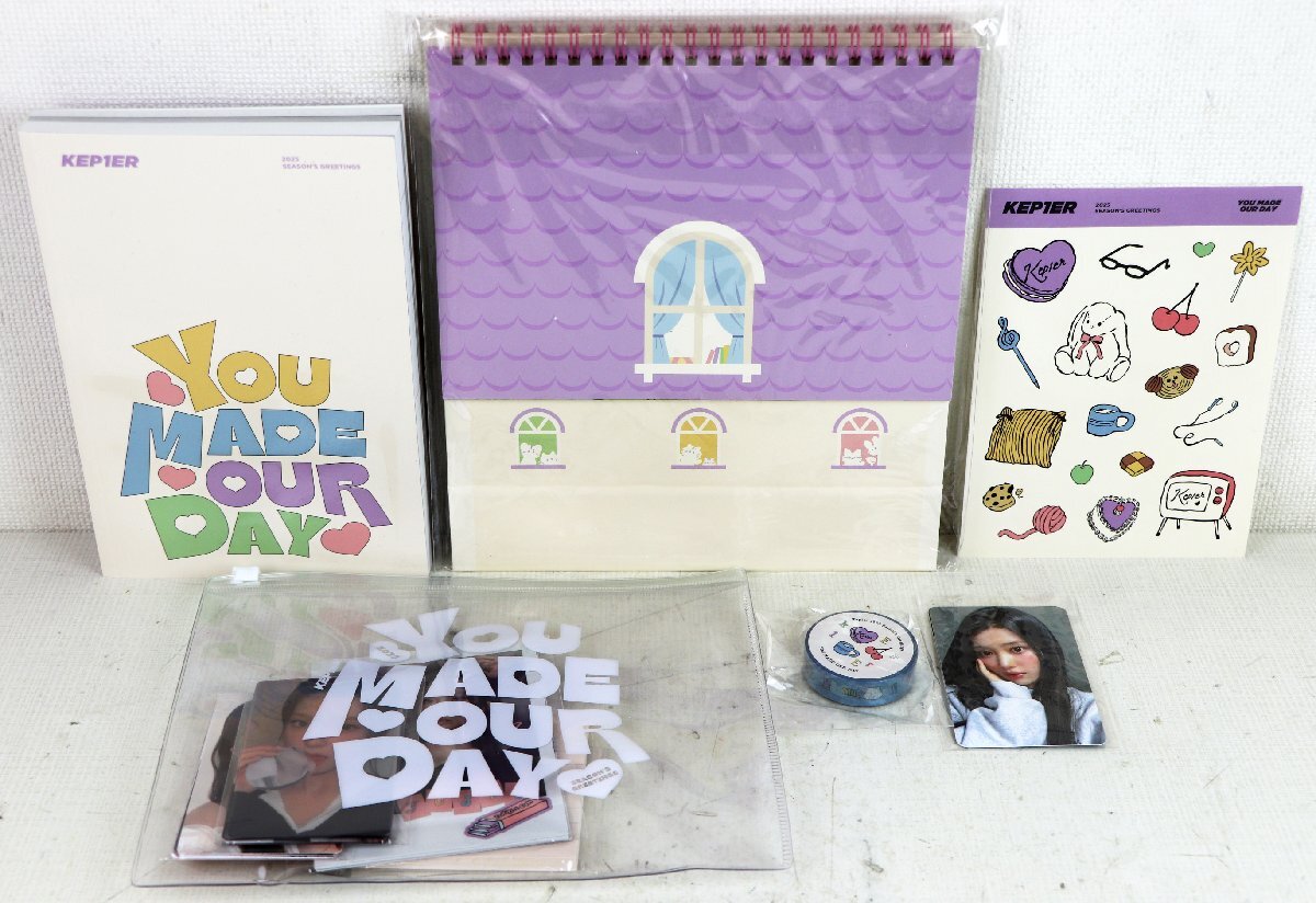 (4066806K) ◆中古品です。 シーズングリーティング 『KEP1ER / YOU MADE OUR DAY』 出版社:KLAP ENTERTAINMENT/クレブエンターテイメント 2025年卓上カレンダー/フォトカード 2種 14枚/ダイアリー/ステッカー/ポーチ/マスキングテープ/ポラロイド セット (7枚)/ステッキーノート/カレンダーカード 2枚 (JULY/NOVEMBER のみ) ◆商品内容 ・化粧箱 ・2025年卓上カレンダー (開封済み) ・フォトカード 2種 14枚 (未開封) ・ダイアリー ・ステッカー ・ポーチ ・マスキングテープ (未開封) ・ポラロイド セット (7枚) (未開封) ・ステッキーノート (未開封) ・カレンダーカード 2枚 (JULY/NOVEMBER のみ) ※商品写真に掲載したものが全てです。 ◆外観 化粧箱に若干のスレ等があります。 フォトカード 2種 14枚、マスキングテープ、ポラロイド セット、ステッキーノートは未開封です。 卓上カレンダー、ダイアリー、ステッカー、ポーチ、カレンダーカードに目立ったキズ・ヨゴレ等はありません。 | ||||