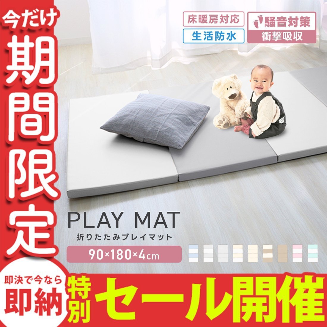 | 思いっきりジャンプ、思いっきり遊んでも大丈夫! 赤ちゃんの安全に遊べるスペースや寝返りマットとして、 元気なお子さまがいるご家庭のプレイマットとして大活躍! 4cmの厚さ、柔らかすぎずちょうど良い硬さで、衝撃吸収はもちろん、 軽くて弾力があり、お子様が転んでしまっても、痛みやケガを防止します。 また、お子さまがお家の中で元気いっぱいに遊んだ時の気になる騒音もしっかり吸収します。 折りたたむことができるのでコンパクトに収納することができます。 リビングでのお昼寝スペース、オムツ替えマット、ハイハイマット、ベビージム、 プレイジム、クッションマット、ラグマット、体操マット、トレーニングマット等、 様々な用途でお使いください♪ 本製品は、ホルムアルデヒド検査基準と染料検査に合格した こだわりの製品仕様となっているため、 小さなお子さまにも安心してお使いいただけます。 【商品仕様】 カラー:グレー×ホワイト サイズ:(約)90cm×180cm×4cm(4段1枚) 折りたたみ時のサイズ:(約)90cm×45cm×16cm 重量:(約)2kg ※新仕様は2.8kg 素材:ポリウレタン、発泡ポリエチレン |