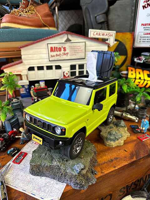 今でも長期の納車待ちが続くスズキの人気車「ジムニー」を1/12スケールで完全再現したウェットティッシュ用ケースです。