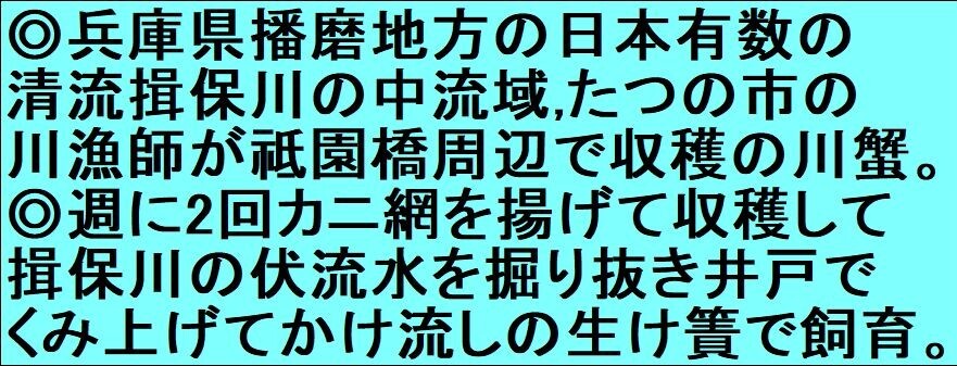 | 商品説明 | ◎兵庫県播磨地方の日本有数の清流揖保川の中流域たつの市の川漁師が祗園橋周辺で収穫した川蟹です。 ◎揖保川の川蟹は厳冬期が旬です。 ◎メスは中サイズから大サイズ、オスは大サイズから特大サイズとなります。 ◎大きさの表記は一般的なモクズガニのサイズの表現とお考え下さい。あきらかに食用に適さない小さなサイズは入れません。 ◎収穫後に揖保川の伏流水を掘り抜き井戸でくみ上げてかけ流しの生け簀で飼育しております。 |