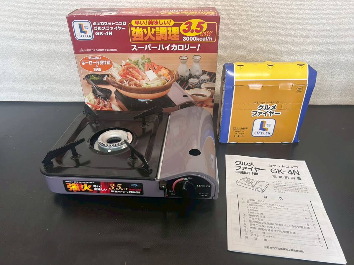 | 11-58 美品 LIFELEX 卓上カセットコンロ グルメファイヤー GK-4N ガス3本セット 画像分 現状品 返品交換不可 | ||