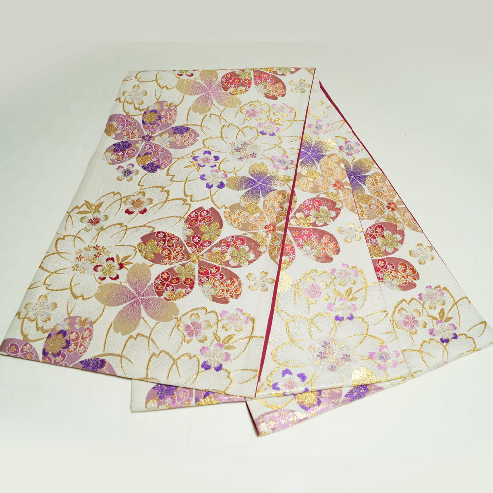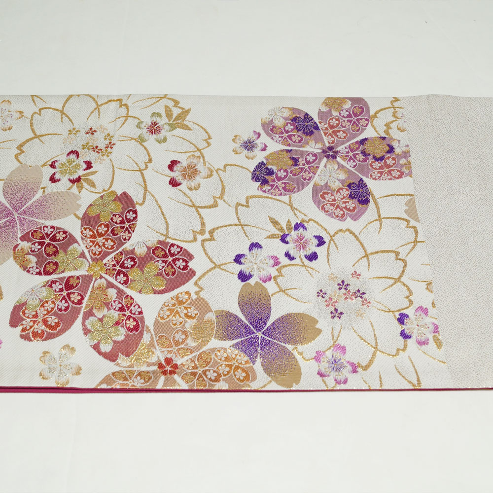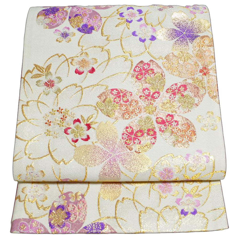 | 商品 説明 | 乳白色系の地に金・色糸の桜花模様が織られた袋帯です。 振袖向きの帯となります。 |