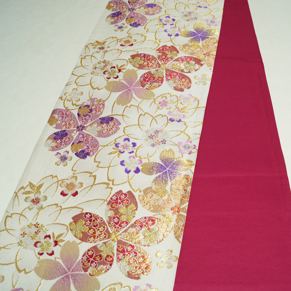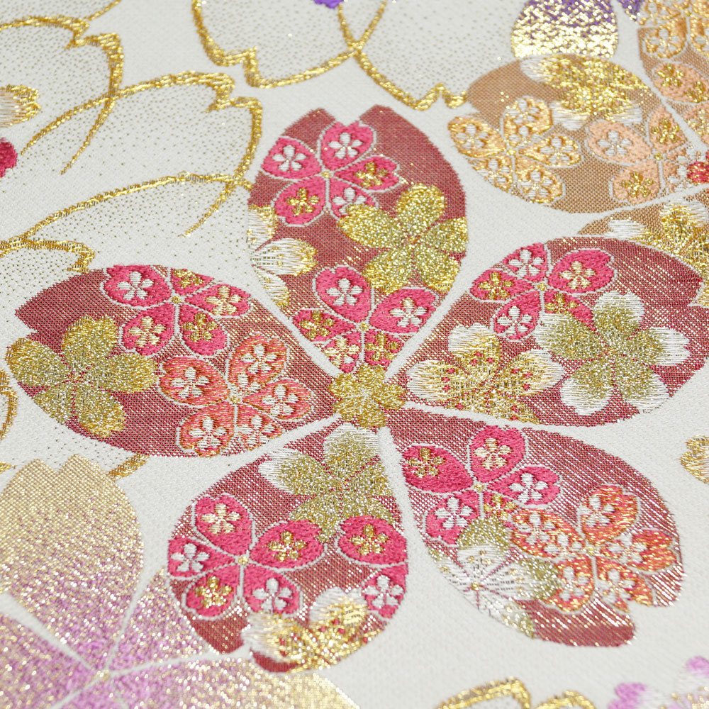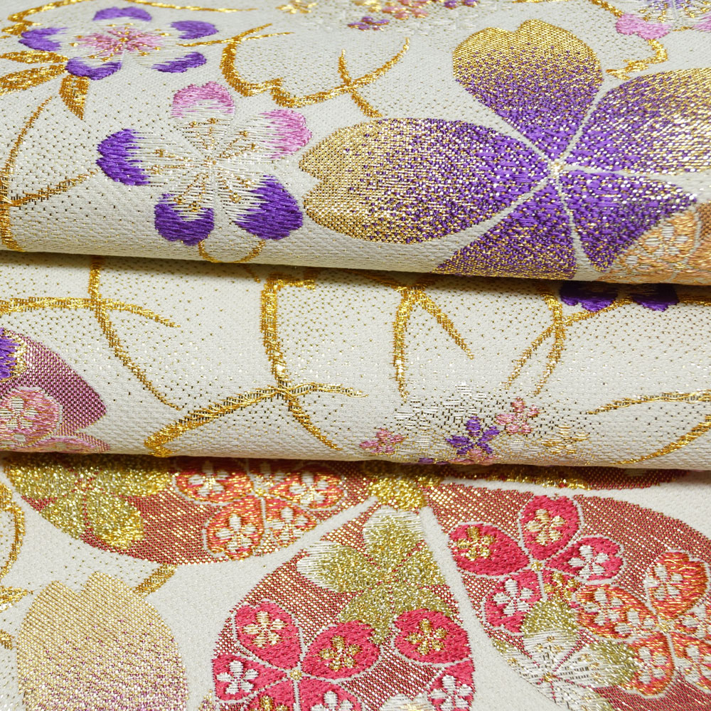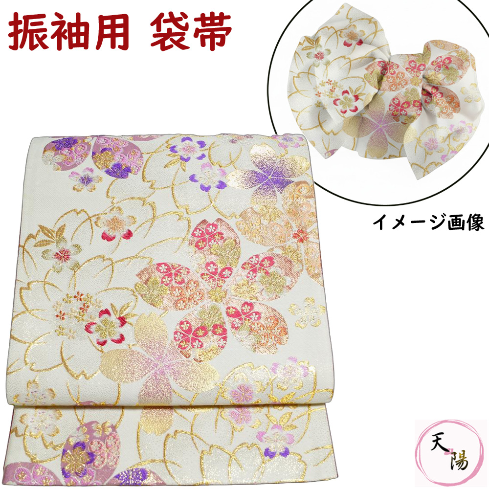 | 商品 説明 | 乳白色系の地に金・色糸の桜花模様が織られた袋帯です。 振袖向きの帯となります。 |