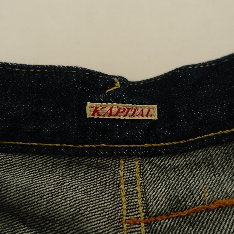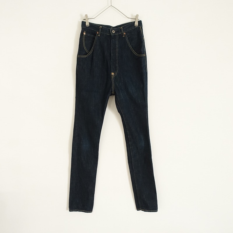 | KAPITALのデニムスキニーパンツです。カラーはインディゴネイビーです。股上の深いスリムなシルエットになっており、フロント開口部はジップフライ仕様です。シンチバック付き、5ポケットです。 |