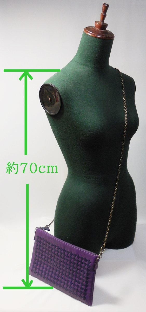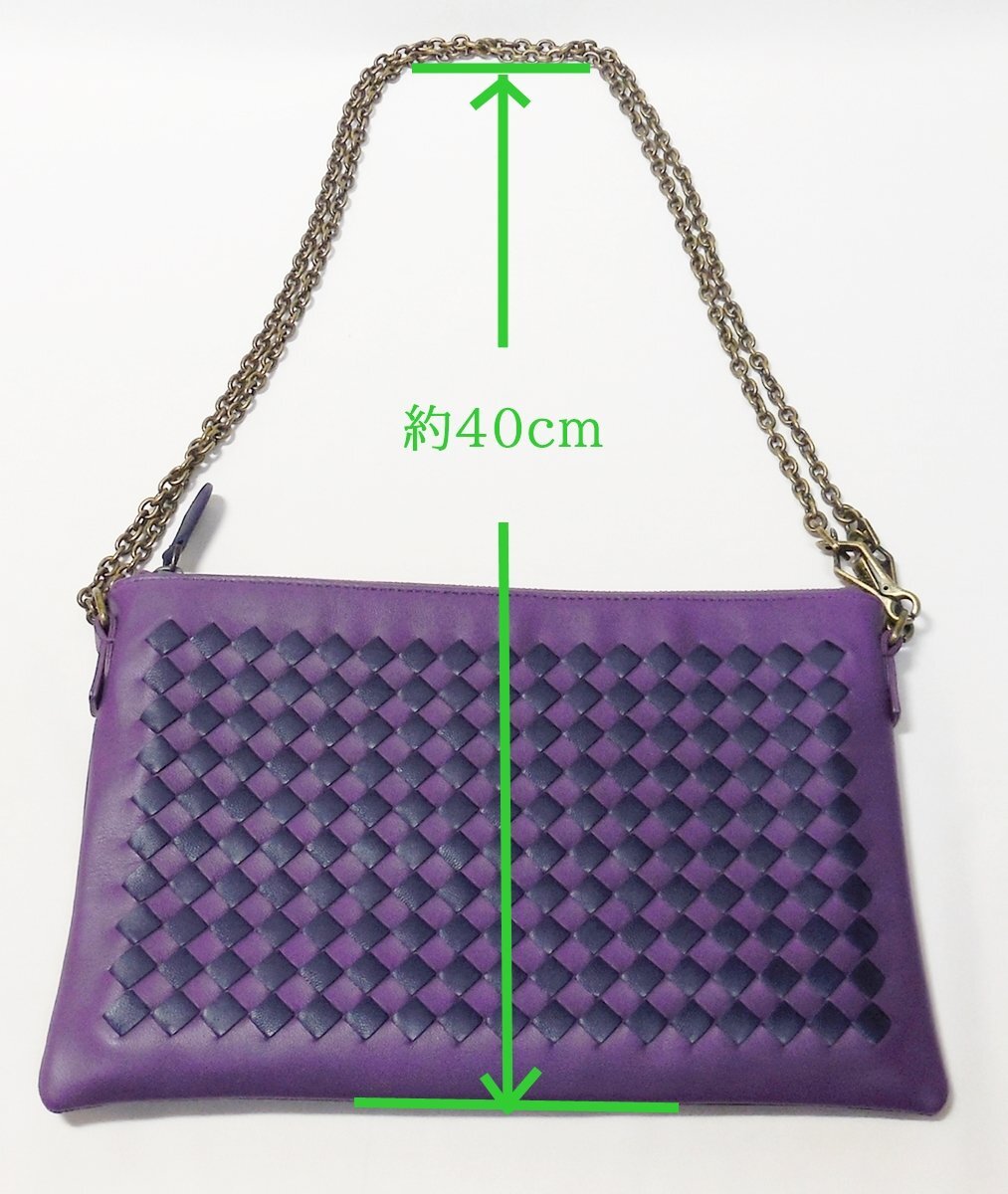 サイズ 約24.5cm x 約16cm、ショルダーチェーン約118cm。斜め掛けの場合肩から約70cm下にバッグ底部がきます。チェーンを2重にして手持ちの場合手元から約40cm下にバッグ底部がきます。