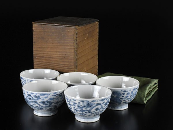 | 茶道具 鳳樹軒文平造 染付 雲龍鳳凰図茶碗4客 獅子図茶碗1点 計5点 まとめて / 煎茶道具 青華 | ||||||||||||||||||||