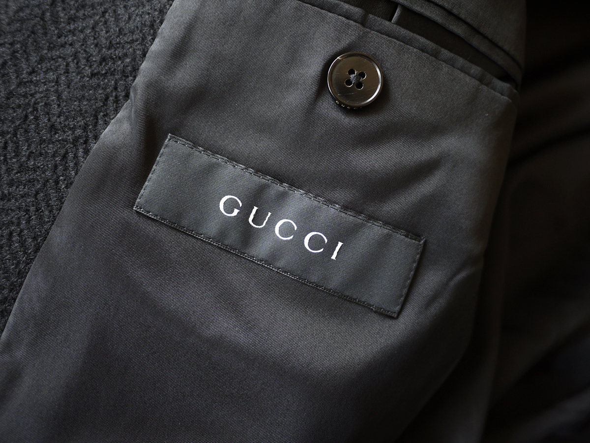 グッチのウールメルトンオーバーチェスターコートでございます。ランウェイ画像同型素材違いモデルです。現代のトレンドにマッチした適度にコンパクトな美しいカットラインで、リラックスした雰囲気とシャープなモードテイストを介在させたようなイタリアトップメゾンに君臨し続けるグッチならではの最高峰のプロポーションです。