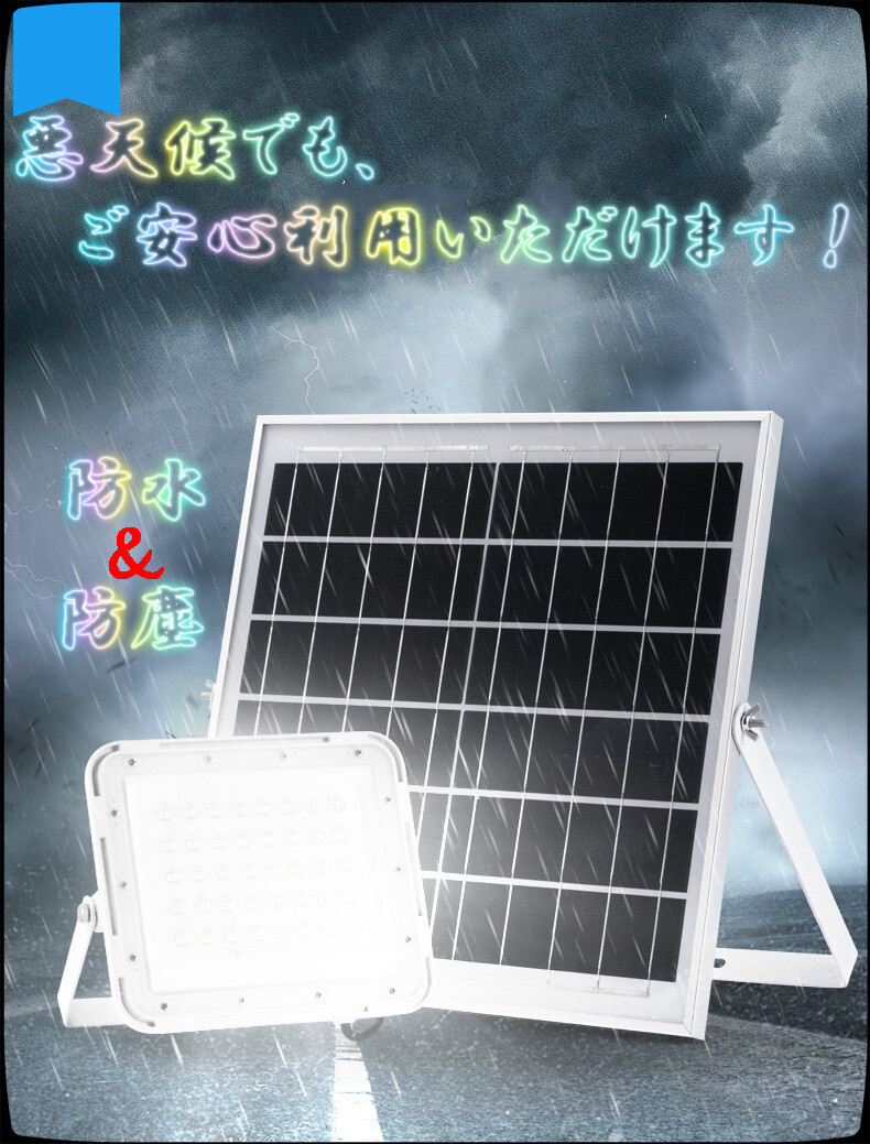 | ●状態:新品未使用 ●使用時間:フル充電で約12時間 ●充電時間:(晴れ)約8時間 ●ソーラー充電式200Wハイパワー相当LED投光器になります。 ●ソーラー充電式なので電気代も掛からないのでお勧めです! ●LEDは消費電力や発熱も少なくまた、長持ちするのでお勧めです! ●本体は高レベル防水加工で、屋外でも安心してお使いいただけます。 ●高輝度SMD搭載で小型ながらとても明るく、夜間の歩道等や電源が取れない場所で大変便利なアイテムです! ●ライトは周りが暗くなると自動でオンになり、明るくなるとオフになります。 ●リモコン操作でライト光量を50%モードや100%モードに変更したり、発光時間も変更が可能です! ●角度調節も可能です。 ◆主な用途◆ 工場、作業場、学校、公共場所、倉庫、駐車場、事務所、展示場、魚場に作業灯、防犯灯、 駐車場灯、LEDワークライト、外灯、街路灯、ガーデンライト、キャンプライト、玄関常夜灯など様々なシーンで活躍します. LEDビーズ数:240個 ソーラーパネルサイズ:(約)350mm×500mm ソーラーパネル:(約)6V30W多結晶シリコン 充電池:28000mAh 防水クラス: IP65 光源: 昼光色 照射角度: 120-180度 照射時間:10-24h 配線長さ:約5m 付属品:リモコン、ボルト・ナット類、アンカー用ボルト、ソーラー用ステー金具 多少の誤差がありましたら、ご容赦をお願いします。 注意事項 ・蓄電バッテリーは投光器内蔵です。必ず投光器とソーラーパネルを接続した状態で充電して下さい。 ・本製品はソーラーより充電されるので、太陽光が当たらない場所に設置すると、性能が落ちる可能性があります ・日中に太陽光が十分に当たる場所に設置して下さい。 ・初期不良のみ交換させていただきます。商品到着から1週間以内にご連絡ください。 ・不良が確認できない場合、往復送料はお客様にご負担となります。 ・交換品が無い場合は、商品代金と送料を返金させていただきます。 ・返品の際、西濃カンガルー便で返送お願いします。 ・他の宅配便で返品する場合、受取を拒否する恐れがありますので、あらかじめご了承ください。 ・輸入商品につき、商品外箱に傷や凹み、汚れなどがある場合がございます。 ・神経質な方は入札をご遠慮ください。 ・ご使用のモニターによって、実際の色と若干異なる場合がございますのでご了承ください。 ・商品到着時にはその場で開封し、破損の有無を確認ください。破損の場合には受け取り拒否を配送業者にお申し出ください。 | |||