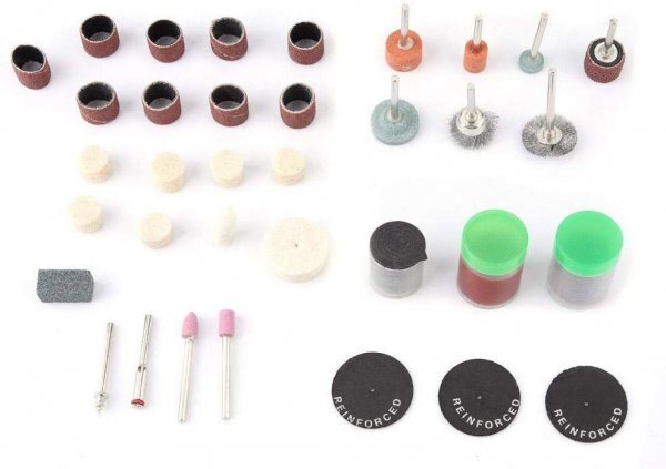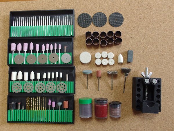■羊毛フェルトバフ、研磨材、スチールブラシ、サンダーバンド、切断砥石、ダイヤモンドカッター、丸鋸カッター、ドリル、ダイヤモンドビット、軸付砥石(金属・石材)などミニルーターでの研磨・切削・切断・穴あけ・彫刻加工などに必要な物がほぼ入っており、ビットと一緒にご使用できる卓上ミニチュアバイスもお付けしました。