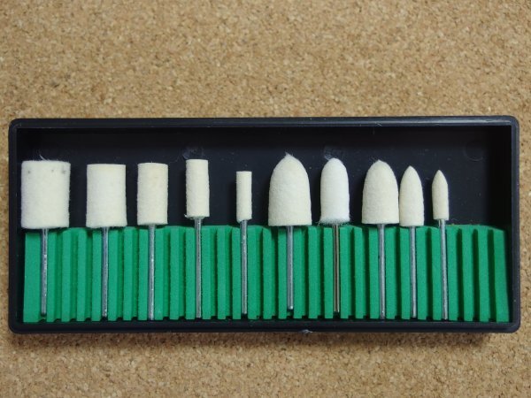 鏡面 研磨 加工用の10個セットのフェルトバフです。 マンドレル軸 は2.35mmで柔らかい羊毛を高密度に圧縮したバフです。