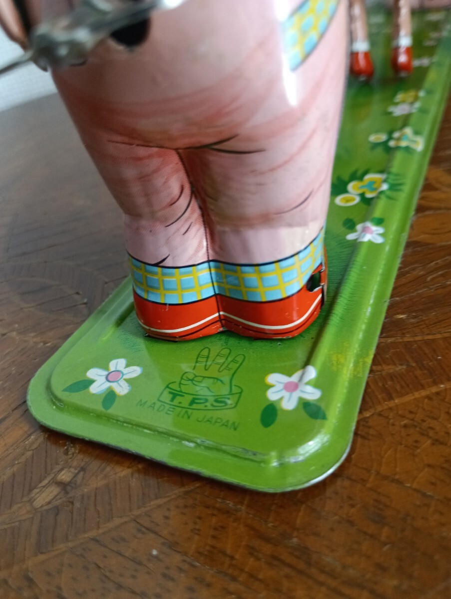 | ★商品説明★ | {商品} 女の子達の縄跳び Girl Skipping Rope 此方は大変珍し女の子達の 縄跳びです。犬達の縄跳びは多く 見られますが、レア-物です。 {サイズ} 台座全長約31.5cm 巾5cm 女の子 14cm 小さい女の子10cm {マーク} 台座の所に3本指のトープレ、TPS Made in Japan {状態} 全体にミントの状態で綺麗です。 内蔵するゼンマイを巻きますと2人の 女の子が縄を回し始め、小さな女の子が 上手に縄跳びを始めます。動作も大変 スムーズに行います。 箱は原型を留めぬほどのダメージですので、 資料とお考え下さい、利用には不可です。 商品をご覧頂き有難う御座います。 |