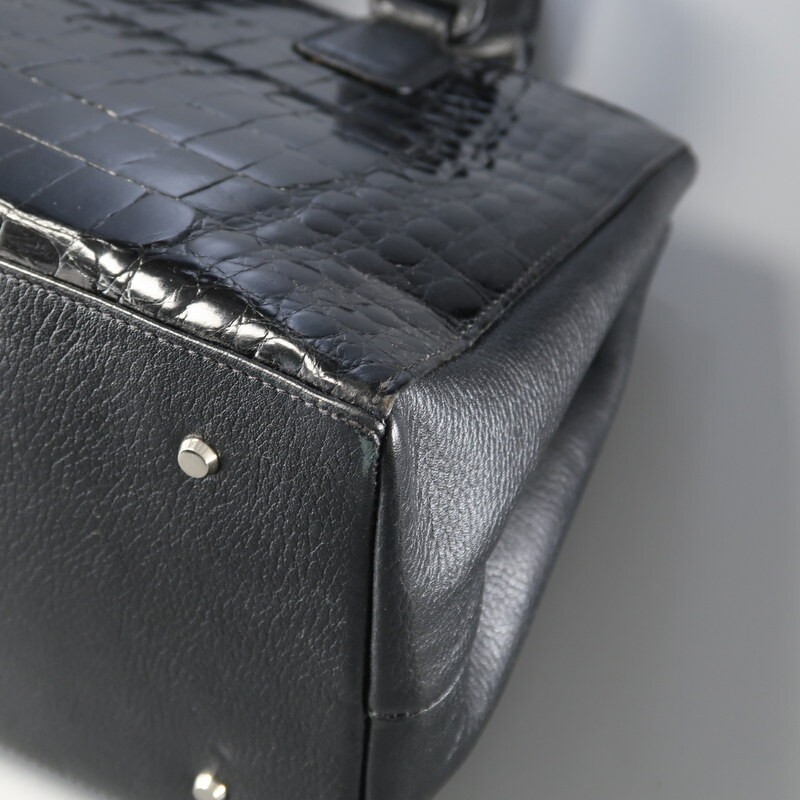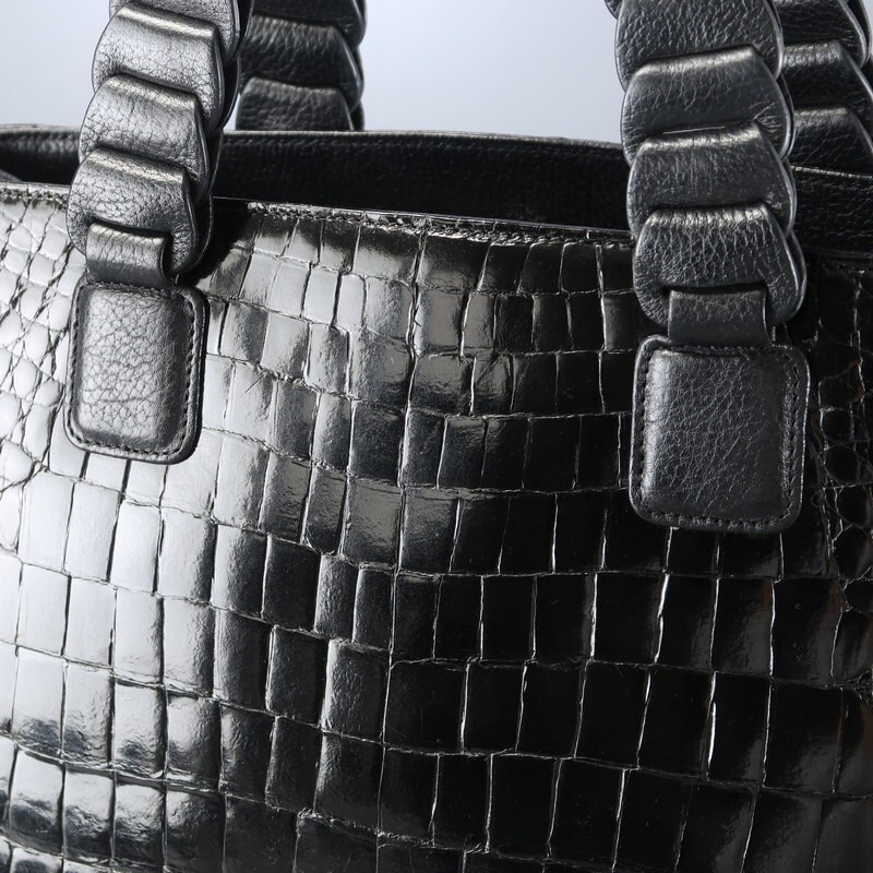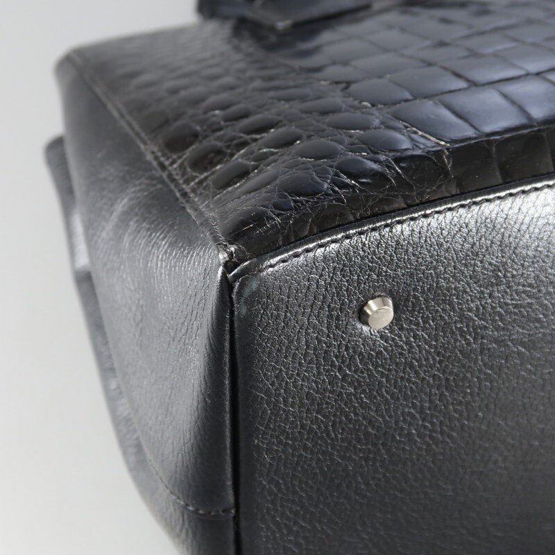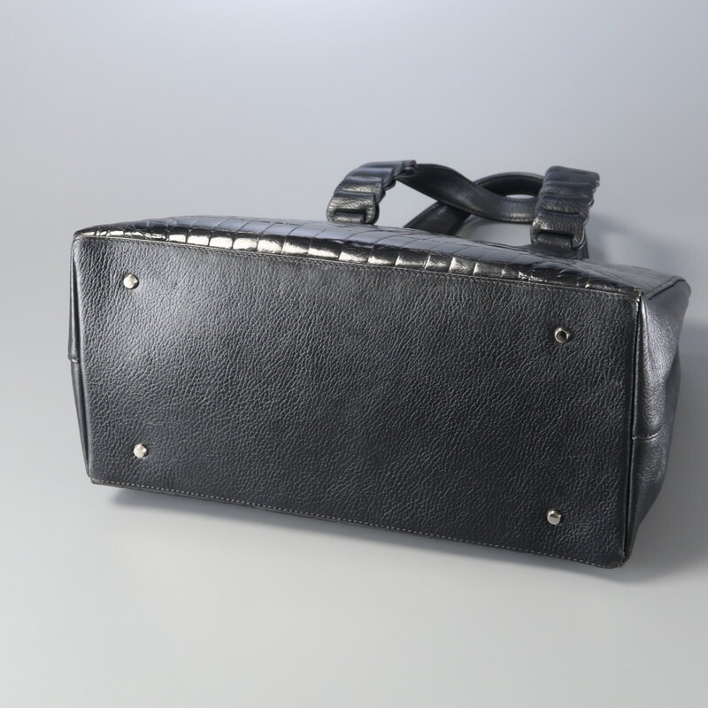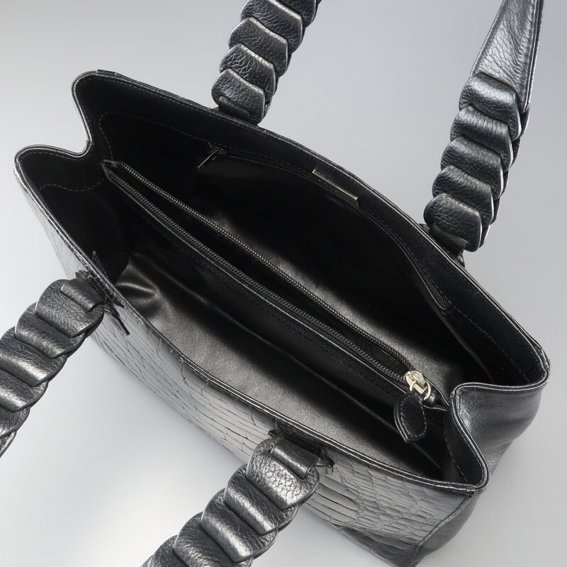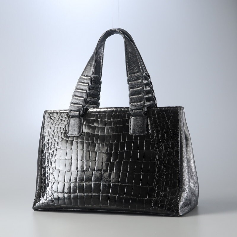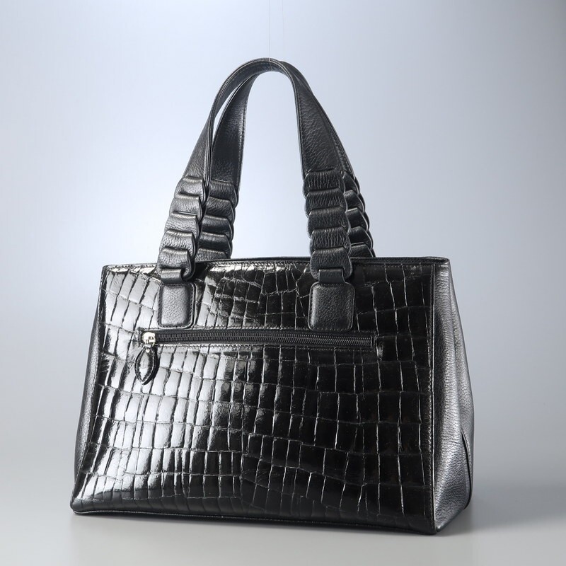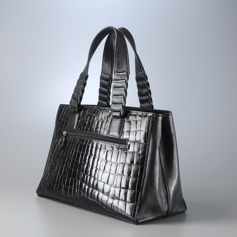 | MI3586▼ロダニア RODANIA*センター取り シャイニングクロコ×レザー トートバッグ ハンドバッグ 鞄 2室構成 本ワニ革 ブラック | |||