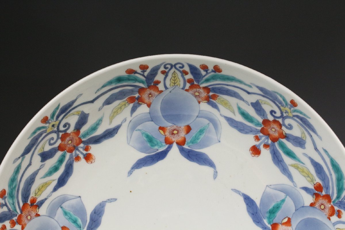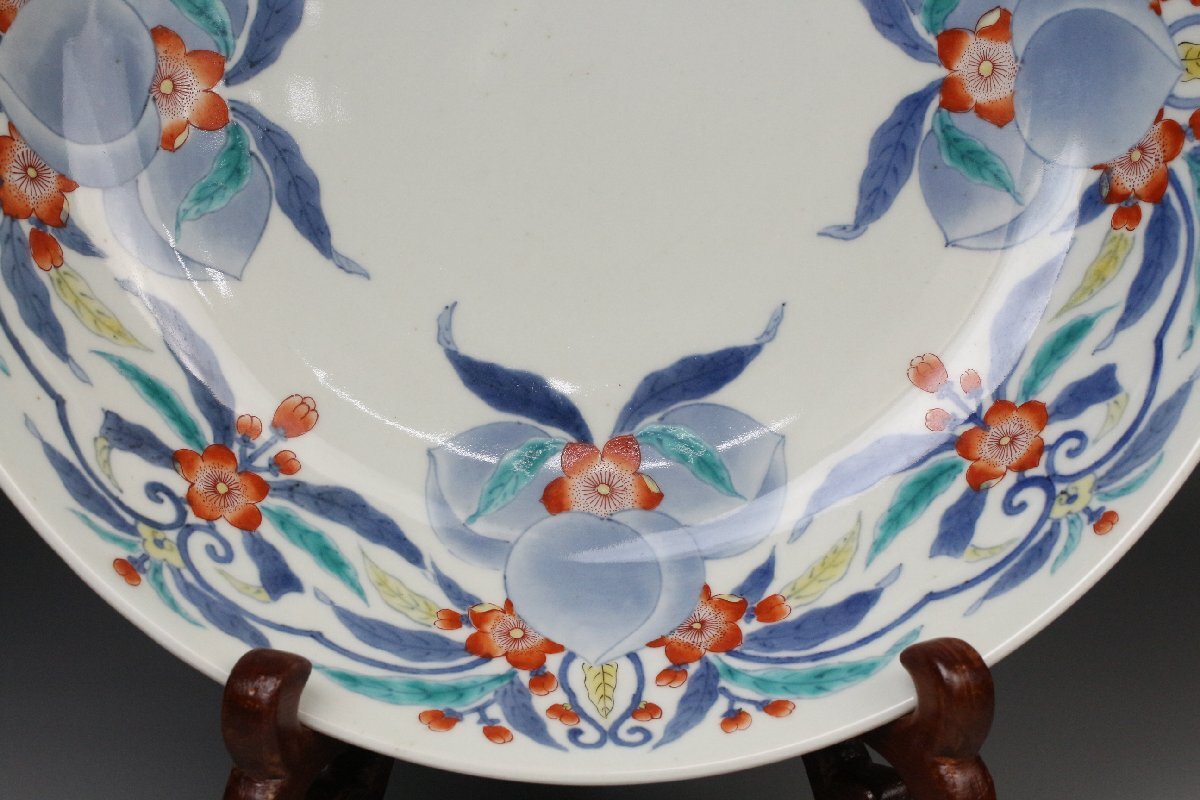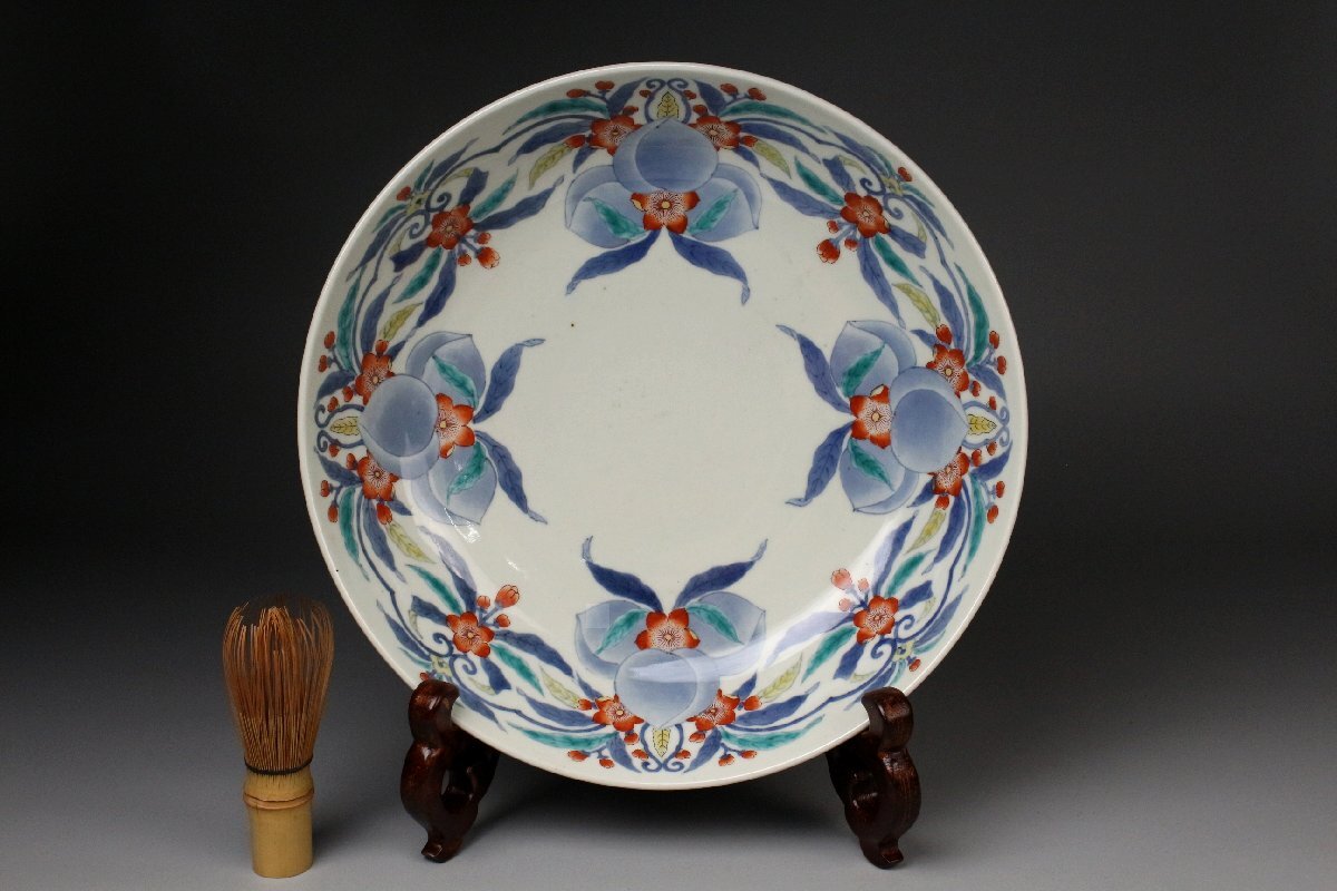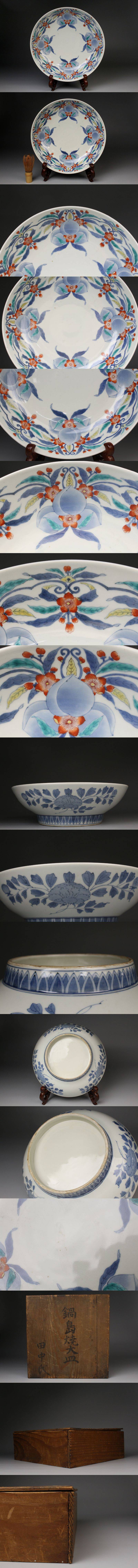 [.EE]25.11 25111717T* * * 商品詳細 * * * ここでしか出逢うことのできない唯一の美をご紹介させて頂きます。 国内磁器の最高峰と称賛される「鍋島焼」 徳川将軍家などの献上品として採算度外視で造られた特別な焼物は 切り立った山々に囲まれた窯場で熟練の職人によって焼成されました。 まさに、当時において一庶民が手にすることのできない門外不出の作品でございます。 本品は30㎝の大きな器に色絵と染付によって桃と花を一周して描いた作品でございます。 呉須の濃淡を描き分けることで絵に立体感を生み、鍋島焼ならではの 色使いが上品に華やかさを演出します。 だみやブレのない絵付けは 作り手の卓越した技巧の高さ伺える見事な仕上がりです。 器の裏には牡丹模様が描かれ高台は蓮弁模様となっており、どの角度から見ても見事な絵付けをご堪能頂けます。 全体的に状態も素晴らしく当時の威厳のある風格を今に伝える逸品でございます。 この機会に是非お手元にてご堪能ください。 ■商品内容/ 皿、箱 ■サイズ/横30㎝×高8.5 箱:四方32㎝×高11.5㎝ ■状態/経年による スレ、小傷、汚れ 箱にスレ、傷、汚れ、蓋の割れがございます。 ※写真にてご確認、ご了承の上ご入札下さい。 ※皿立ては付属致しません。